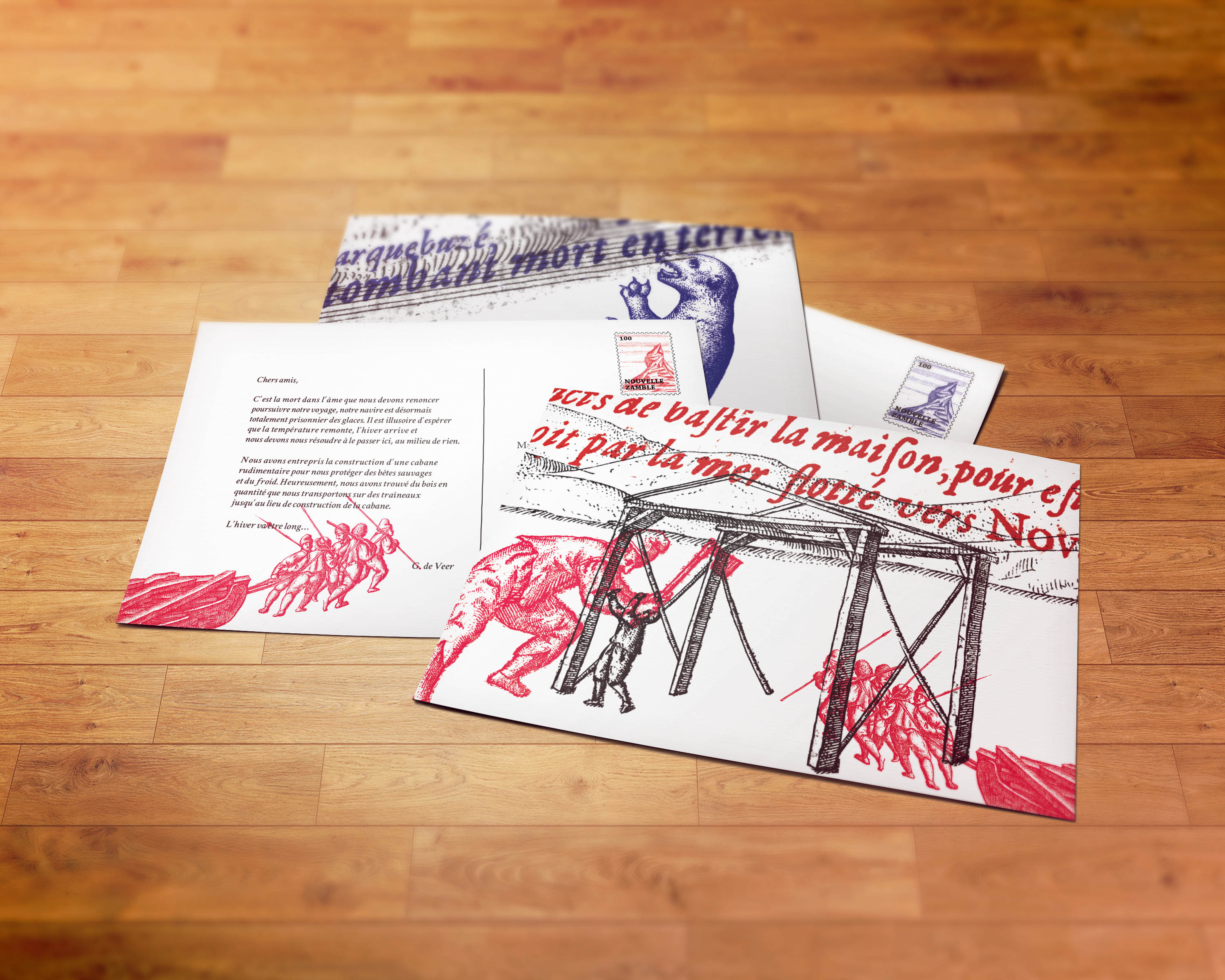 La correspondance is a proposal for a series of postcards based on a 16th century correspondence describing a series disasters and mishaps during a perilous trip to the north pole. Each post card contains a section of the original text. Readers buy the entire story through a subscription service, which then sends out each section of the story synchronized to its original reception date. La correspondance therein reproduces the real-time effects of following a difficult journey over several months: accidents, animal attacks, medical emergencies, mutilation, mutiny, survival and/or death.