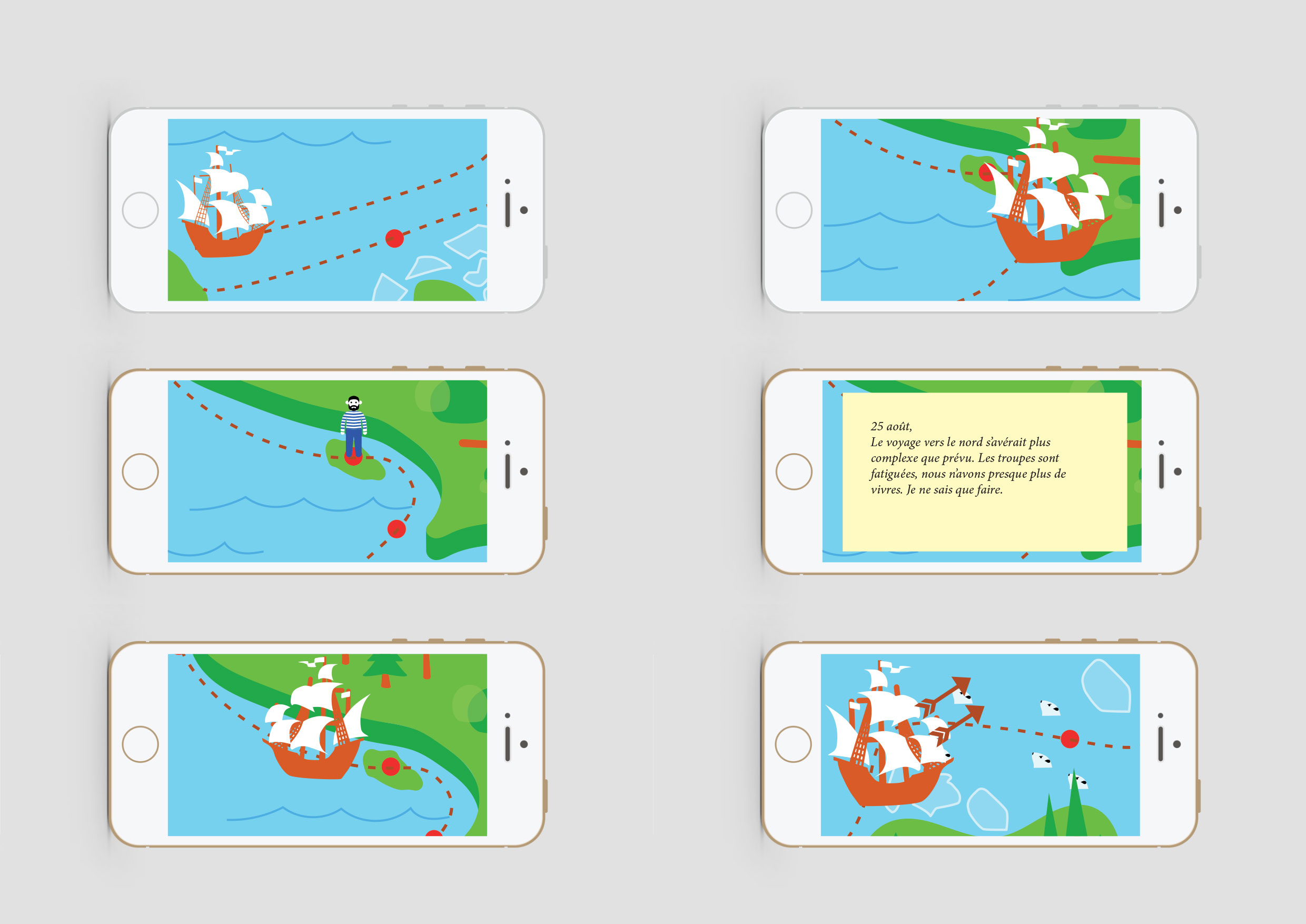 Avec notre application, nous avons créé un complément d’histoire, qui n’est pas un jeu, où le récit de l’équipage est raconté avec des animations et des résumés de texte. Nous nous sommes basées sur les 13 gravures de Théodore de Bry et en avons fait des étapes de récit, du départ d’Amsterdam jusqu’au retour.