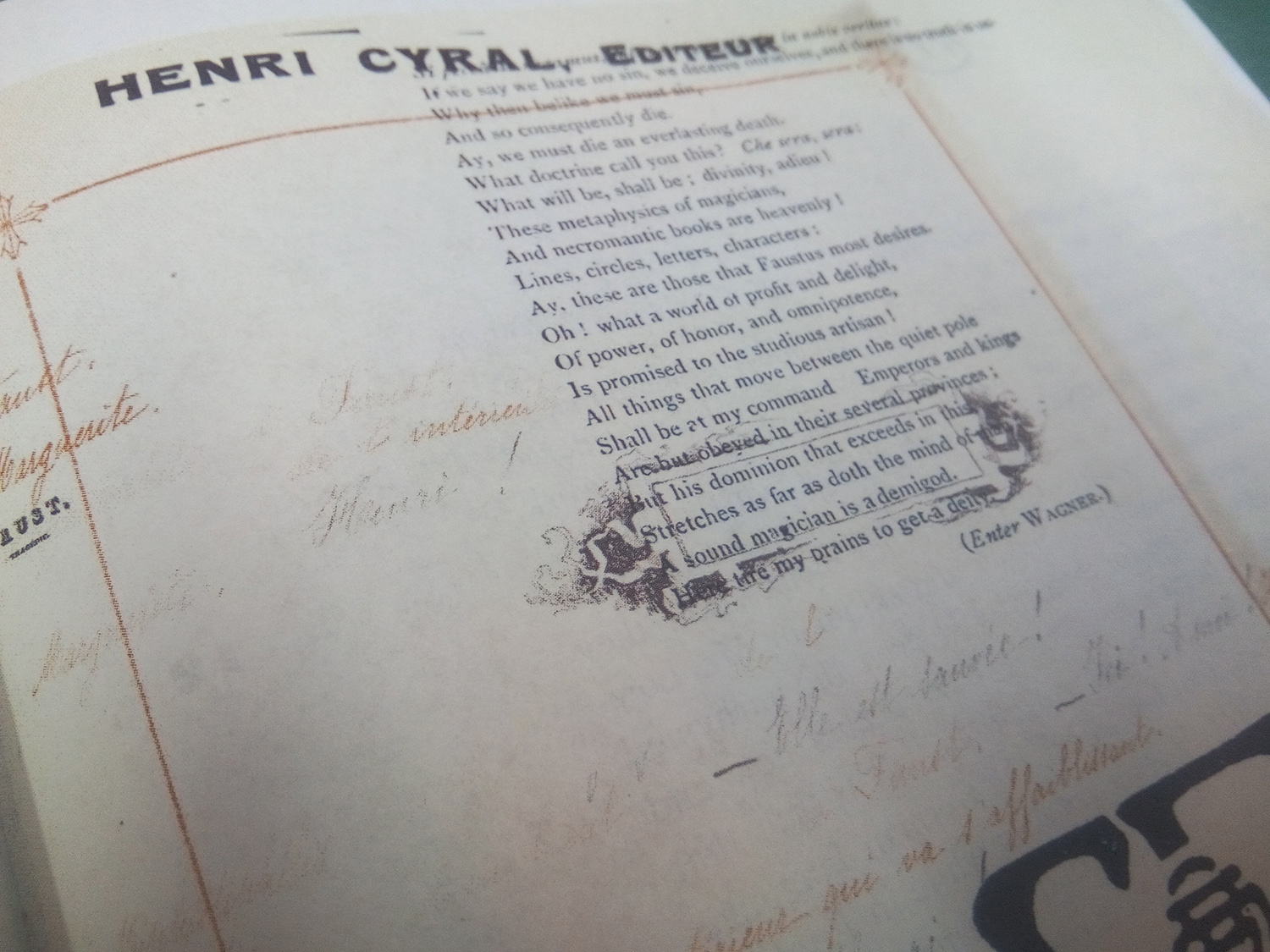 Processus. Le départ de notre travail est l’intérêt pour les aspects des livres qui ne sont pas, ou que partiellement, transmis par la numérisation. Le format, le poids, la texture ou l’odeur du livre ne sont expérimentables qu’en présence du volume en question. Comment, dès lors, évoquer ces aspects et redonner à la collection sa matérialité ? Le thème de Faust a retenu notre attention par son importance dans la Collection Bodmer. Le mythe du savant qui vend son âme au diable pour bénéficier d’un savoir plus grand nous a également paru représenter la quête de Martin Bodmer cherchant à créer la bibliothèque mondiale. Le grand nombre d’éditions du Faust de Goethe était une excellente occasion de travailler avec des contenus extrêmement diversifiés qui traitent d’un thème unique. Notre réponse au défi de communiquer la diversité et la matérialité de la collection s’incarne dans une nouvelle édition de Faust. Nous avons choisi d’extraire les éléments de livres numérisés, de les traiter et les injecter dans un programme, créé pour l’occasion, qui nous a permis d’en faire les pages de notre nouvelle édition.