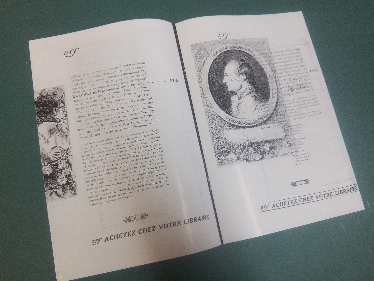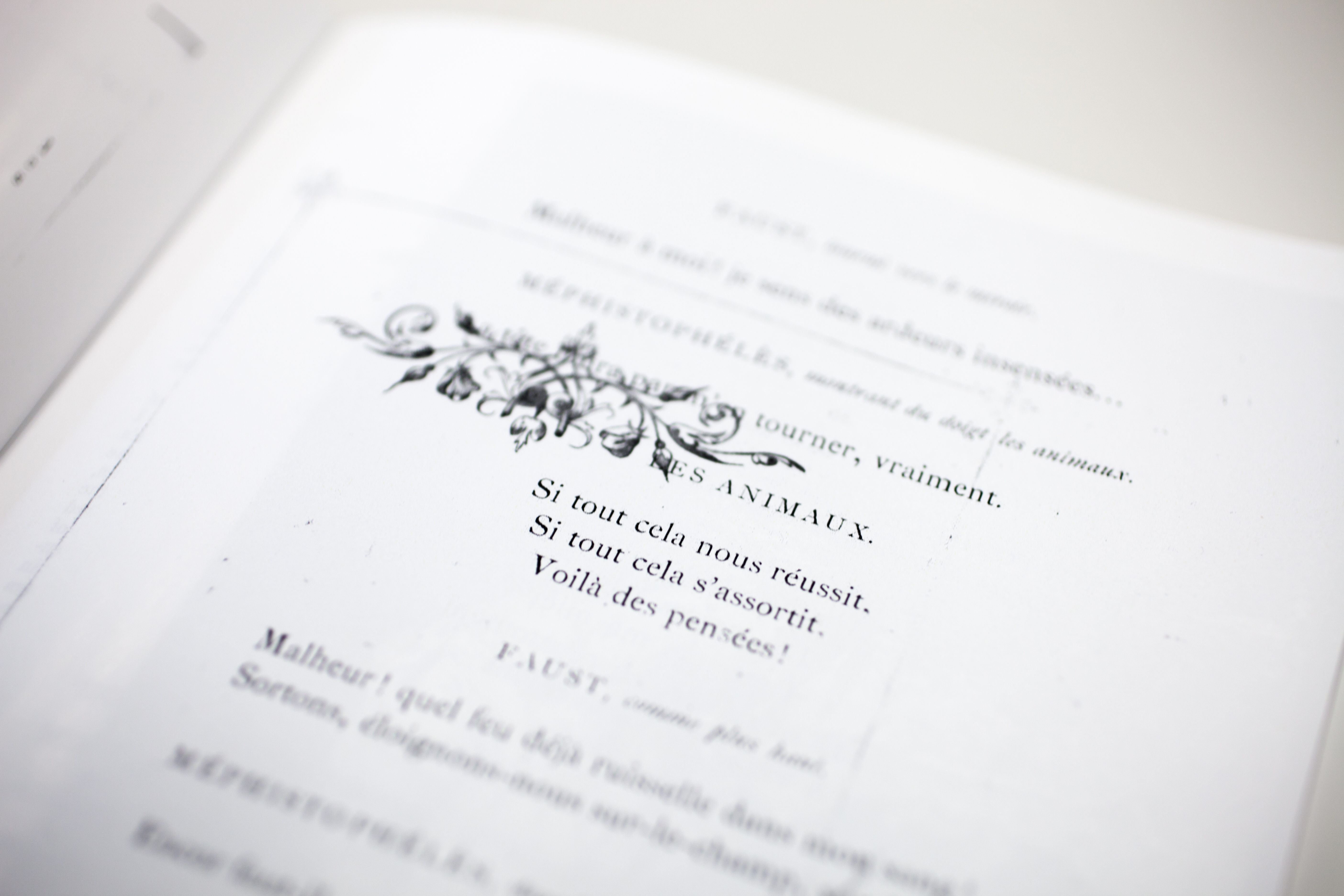 UltimateFaust. Ce projet propose de présenter la Collection Bodmer au travers d’un ouvrage ultime. Puisant dans la longue liste des éditions du Faust de Goethe, il en reprend des éléments qui caractérisent chaque livre, au-delà du texte lui-même. Le mythe de Faust, cher à Martin Bodmer, raconte l’histoire d’un homme qui cherche à atteindre la connaissance universelle, au point de vendre son âme au Diable. De la même manière, ultimateFaust réunit les plus belles caractéristiques de chaque ouvrage et les fonde dans un seul volume. Ce projet représente la Biblioteca Bodmeriana dans sa variété et dans son ambition. Loin d’être une sage réinterprétation graphique d’un récit maintes fois édité, ultimateFaust cherche à transmettre les particularités des différents volumes qui le composent. Reprenant le texte de l’un, les illustrations d’un autre, la pagination d’un troisième ou les ornements d’un quatrième, il mêle tous ces éléments dans un objet complexe. Cet enchevêtrement de signes fait directement écho au Faust alchimiste de certaines versions du mythe. De support, le livre se transforme en objet intrigant, dont le texte n’est plus la seule raison d’être.