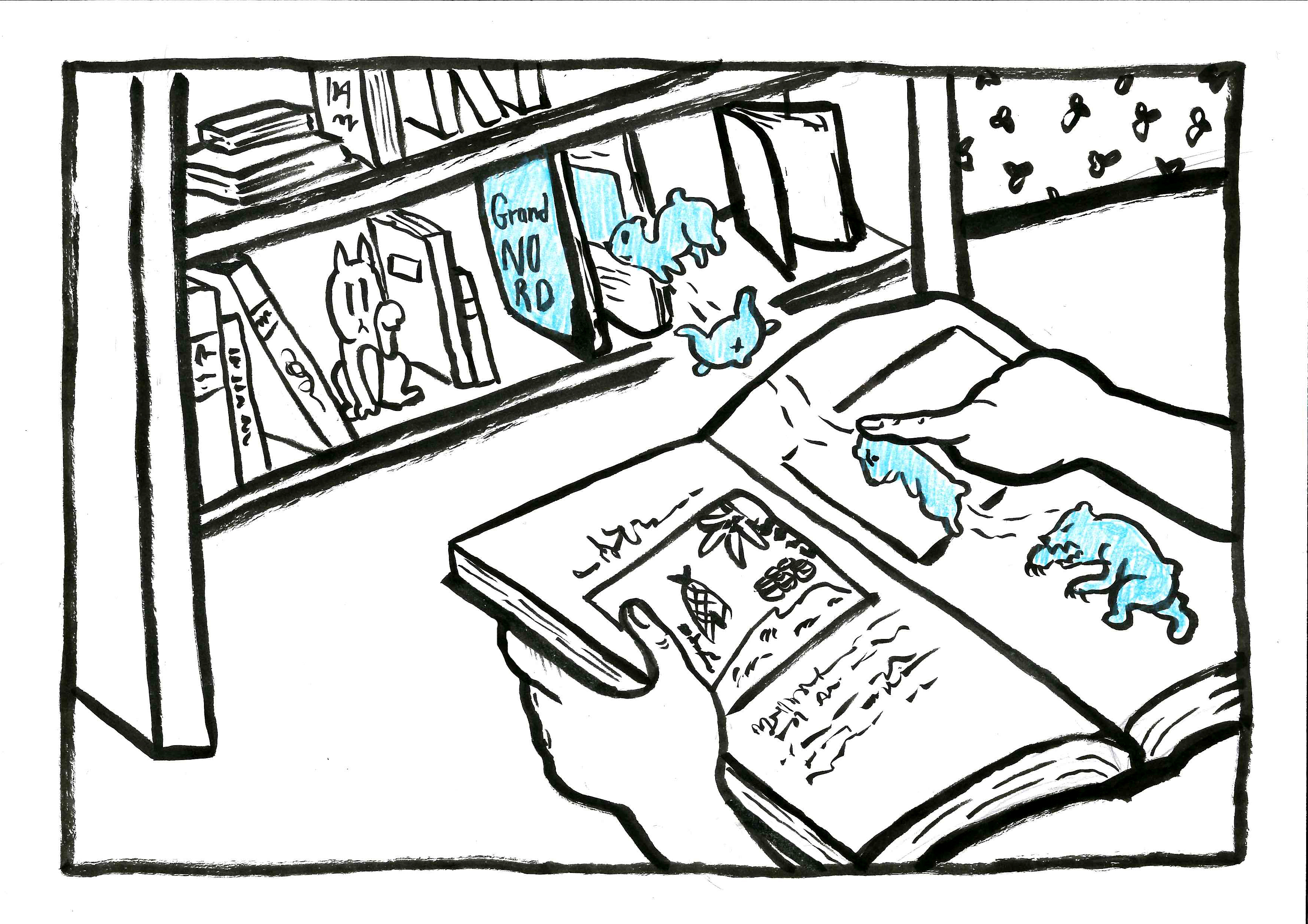 Par rapport au Bodmer Lab, nous avons choisi le récit de Gerrit de Veer (livre de Théodore de Bry, avec gravures), « Voyage vers le Nord ». Ce livre du XVIe siècle a été numérisé par le Bodmer Lab et est disponible en ligne. Nous avons voulu rendre accessible les livres numérisés aux enfants, avec un récit simplifié et un graphisme efficace.