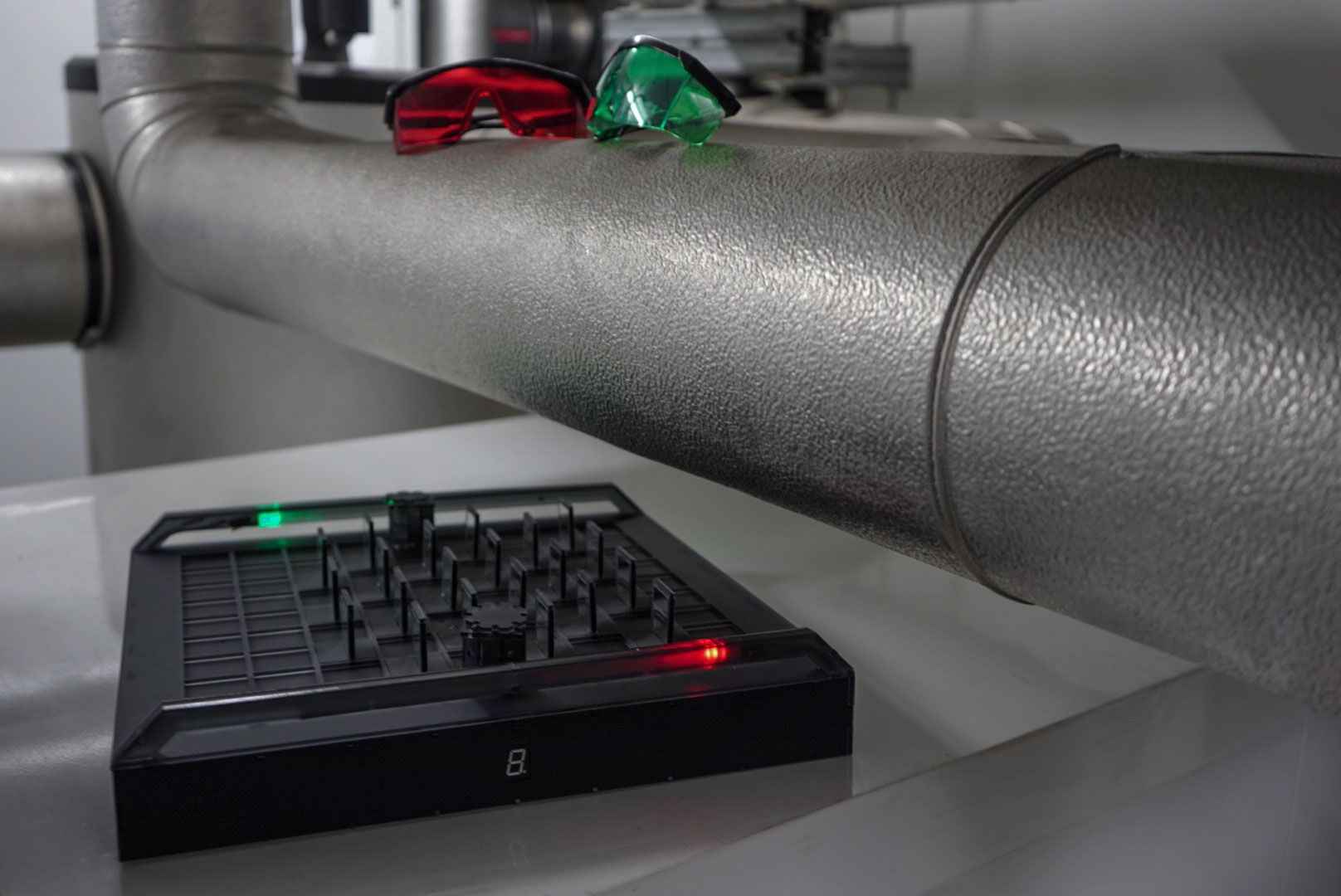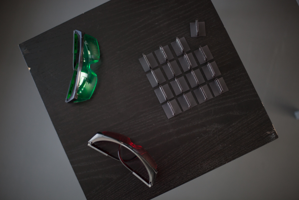 - installation: Boitier (35,5 cm35,5 cm4cm) plexiglas, miroir, led, cablage, pile 9V, lunette 632nm, lunette 569nm