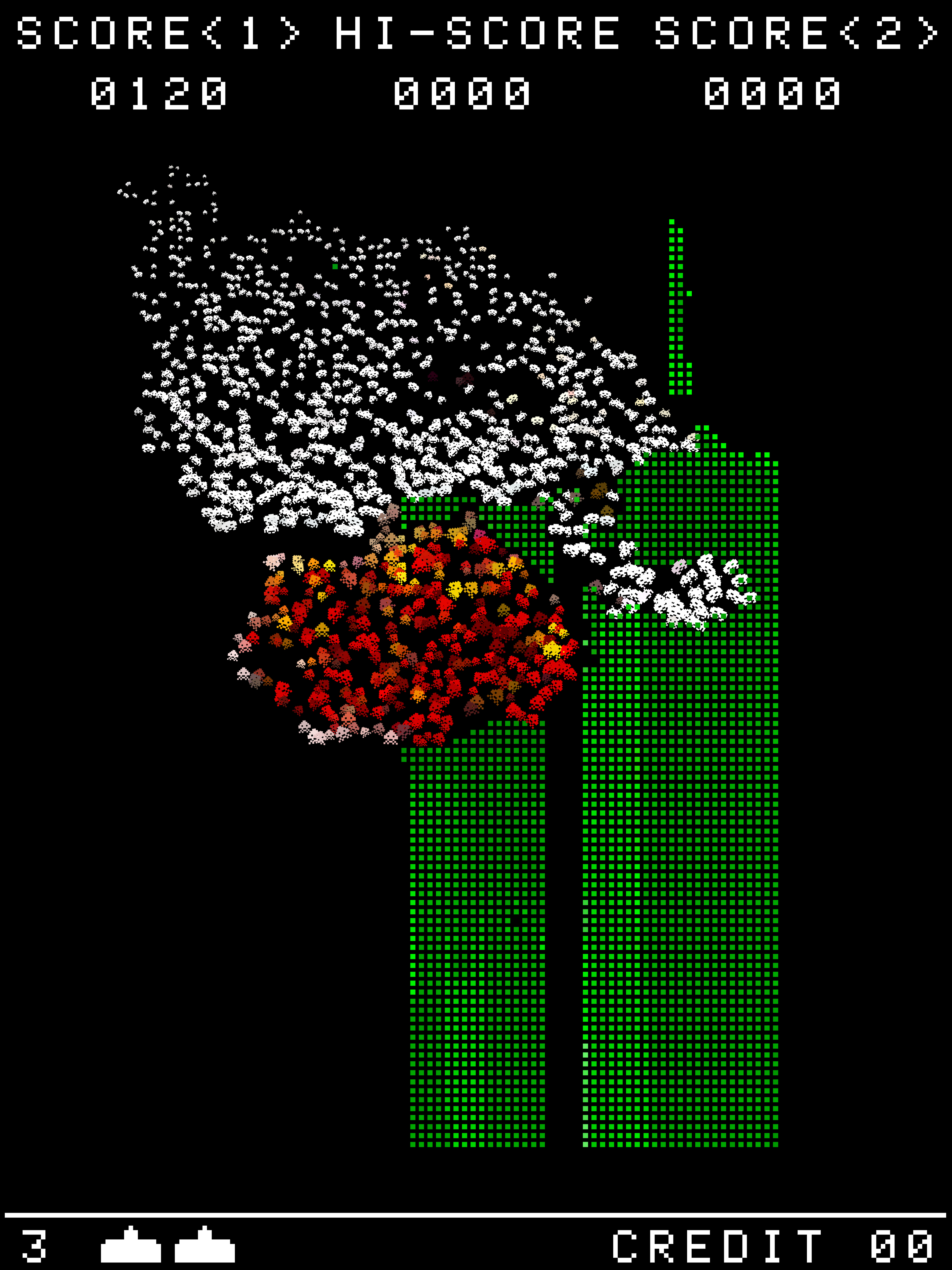The way in which the game play was designed, it is actually possible to endlessly "beat" the game by simply getting enough people to shoot at it with their arms, feet, head, whatever. The Invaders! will of course never give up, but that was also the power of coin-operated games. The "Game Over" screen is an integral part of its narrative arc; one can nevertheless delay that arrival, finding different strategies of keeping it at bay, and that was always the emotional power of this form of gaming.