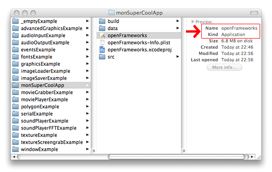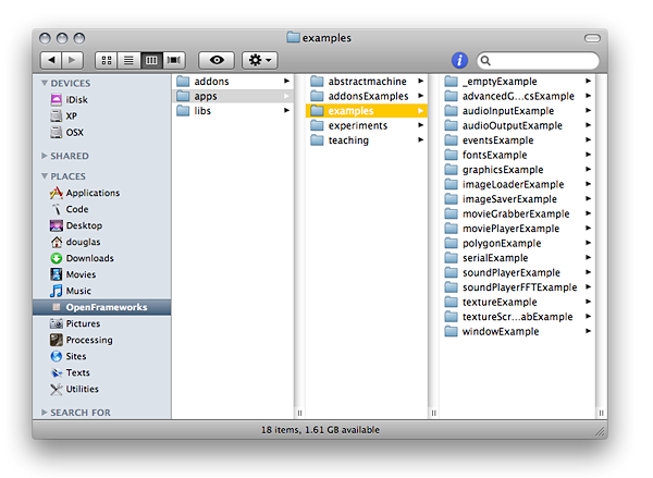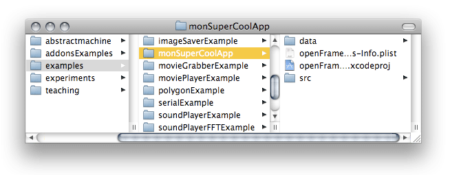 A l'heure actuelle, OpenFrameworks s'organise sous forme d'une série de projets où la plupart des connexions nécessaires ont déjà été reliées pour vous. Vous pouvez installer ces projets où vous voulez sur votre ordinateur, par exemple quelque part à l'intérieur du dossier Documents (sur mac) ou Mes Documents (sur Windows). Le plus important, c'est juste de respecter la hiérarchie des sous-dossiers que vous venez de télécharger.