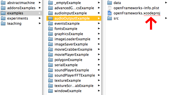 Ici, j'ai choisi l'exemple audioOutputExample. Dans ce dossier vous trouverez deux sous-dossiers importants : celui qui contiendra vos données (data) et celui qui contiendra votre code (src = codes sources). Sur mac vous trouverez ensuite le fichier openframeworks.plist qui sert à configurer votre programme (lui donner un nom, etc) et enfin le fichier qui nous intéresse, le openframeworks.xcodeproj qui est le projet à proprement parler. Doublez-cliquer sur ce fichier pour ouvrir votre projet dans xCode.