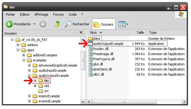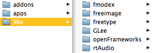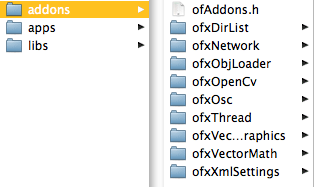 A la racine de ce dossier OpenFrameworks FAT se trouve trois sous-dossiers : addons, apps et libs.