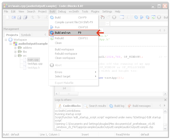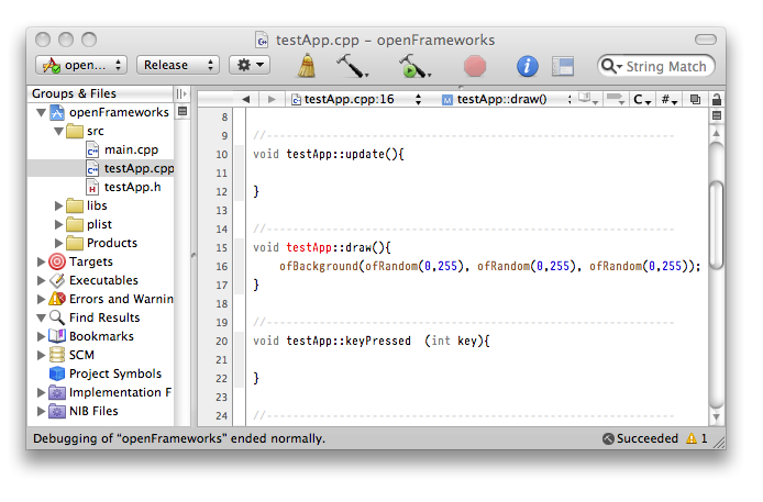 Regardez rapidement ce projet à l'intérieur de CodeBlocks (Windows/Linux) ou XCode (mac). Il contient notamment trois fichiers qui donneront les instructions spécifiques à notre programme : main.cpp, testApp.cpp, et testApp.h que vous trouverez dans le dossier src. Vous trouverez également les sous-dossiers libs qui contiennent le code (générique) de la bibliothèque OpenFrameworks qui permettra à votre programme (spécifique) de fonctionner.