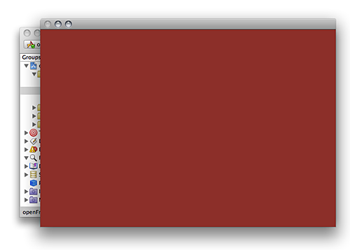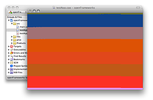 Si vous avez tout installé correctement, votre première application OpenFrameworks devrait se mettre à convertir votre code en des instructions machine (notez la petite icône de progression en bas de votre éditeur de code) -- on appelle ce processus l'étape de « compilation ». Une fois cette étape terminé, votre programme devrait s'ouvrir automatiquement sur votre machine et s'executer.