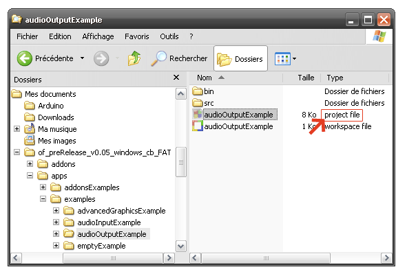 Si vous êtes sur Windows, il s'agit du même procédé, sauf qu'il faut ouvrir le fichier audioOutputExample en vérifiant que vous avez sélectionné le project file et non pas le workspace file.