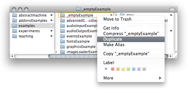 Nous allons maintenant créer notre propre programme. Allez dans le dossier examples et sélectionnez l'exemple _emptyExample. Dupliquez ce dossier, et donnez-lui un nouveau nom.