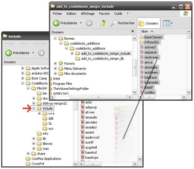 add_to_codeblocks_mingw_includeet comme indiqué, copiez-les dans le dossierProgram files > Code Blocks > minGW > include. Attention de copier les fichiers dans ce dossier et de ne pas juste déplacer le dossier lui-même.