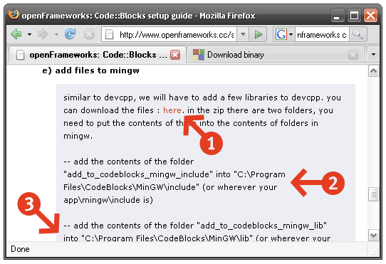 - 2/ Retournez au « CodeBlocks Setup Guide » du site d'OpenFrameworks et téléchargez sous l'étape (e) les « CodeBlocks addons » (#1) que vous aller ajouter à votre copie de CodeBlocks que vous venez d'installer (#2 & #3).