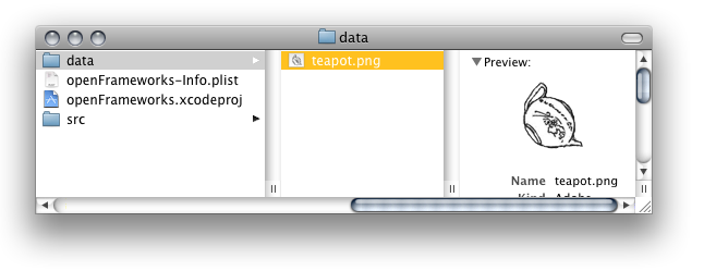 Pour l'utiliser, il nous faut un dossier data dans lequel nous allons mettre le fichier .jpg, .gif ou .png. Ici il s'agit de teapot.png. Nous avons utilisé le format png (png-24 précisément) pour pouvoir inclure une couche alpha (une transparence progressive à 8 octets). Créez donc ce dossier dans votre projet, et placez ce fichier dedans.