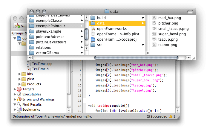 Executez votre programme en appuyant sur F9 (Code::Blocks) ou Cmd-R (xCode). Observez ce qui se passe quand vous cliquez sur l'écran : un nouvel objet se créé dans le vecteur vaisselle, et s'anime. Sachez que chacun de ces objets partage la même image et ne charge pas inutilement ce fichier plusieurs fois. En réalité, chacun des objets « pointe » vers la même image dans la mémoire de la machine. D'où l'expression pointeur.