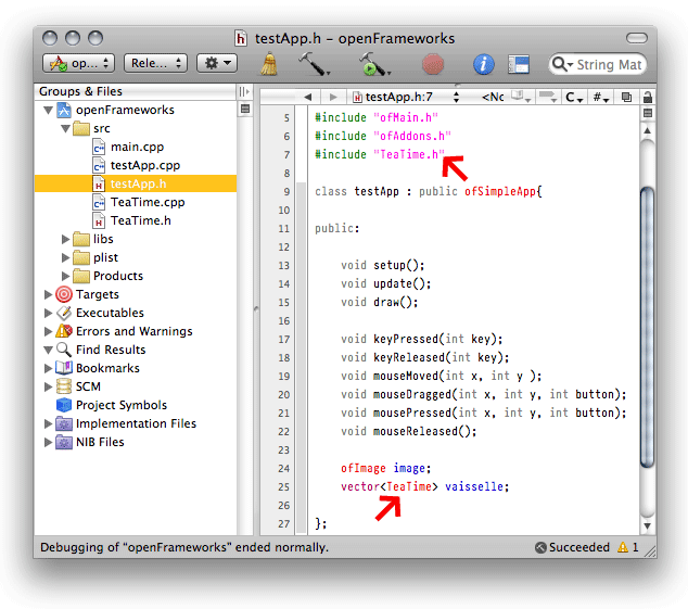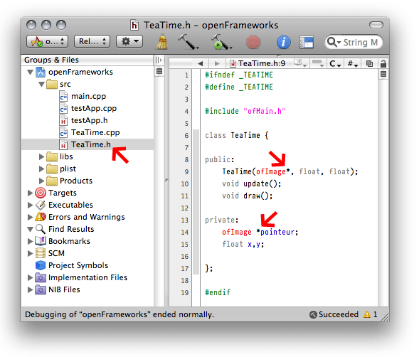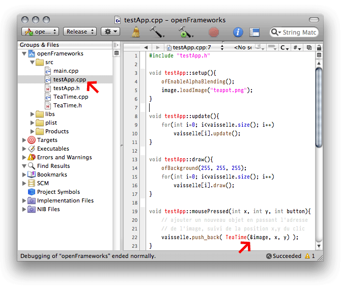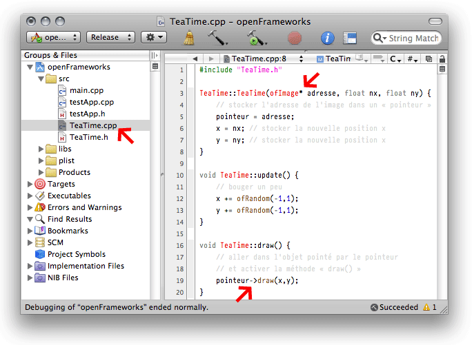 Enfin, modifiez votre testApp.cpp en ajoutant l'animation, l'affichage et l'augmentation des objets de votre classe TeaTime. Notez également l'usage d'un nouveau signe, le signe & qui indique également l'usage d'un pointeur dans notre programme :