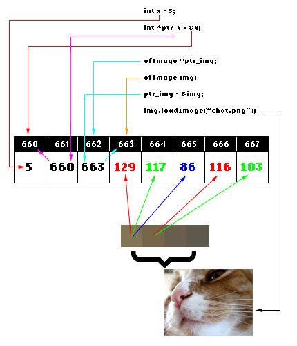 Comme on voit dans l'illustration, x contient une valeur, 5, stockée dans la barrette de RAm à l'adresse 660. Ensuite le pointeur de x, ptr_x contient la valeur 660. Il existe donc des variables qui contiennent des valeurs, puis des variables qui contiennent des « pointeurs » vers l'adresse d'autres variables.