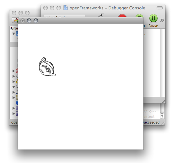 Ensuite, aller dans votre fichier d'implémentation testApp.cpp, importez l'image dans le setup() et affichez l'image dans le draw(). Si vous avez une image avec une couche alpha (comme la notre), activez également au début du programme l'utilisation des couches alpha (cf. ofEnableAlphaBlending()) :