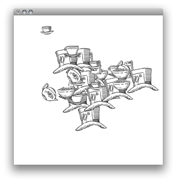 A chaque clic de la souris, nous appelons le constructeur TeaTime() en lui passant trois valeurs : l'adresse de l'image, la position x, et la position y. Ce qui veut dire, « créez-moi un nouvel objet de type TeaTime, voici l'adresse de son image, puis les valeurs x et y de la souris ».