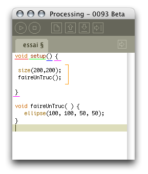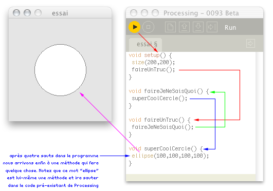 ...vous êtes en réalité en train de faire appel à une méthode pré-existante, écrite pour vous par les concepteurs de Processing pour vous faciliter la tâche. Il s'agit une méthode pour faire quelque chose avec l'ordinateur, autrement dit une suite d'instructions qu'on peut appeler en juste tapant un seul mot.