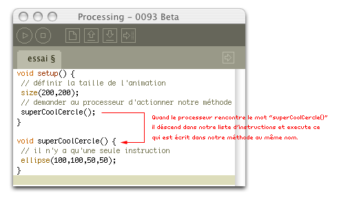 Nous venons d'inventer une méthode, que nous avons nommé superCoolCercle. Chaque fois que le processeur rencontre ce nom, il executera les instructions contenues dans notre méthode. Si on écrit trois fois notre méthode, le processeur l'executera trois fois.