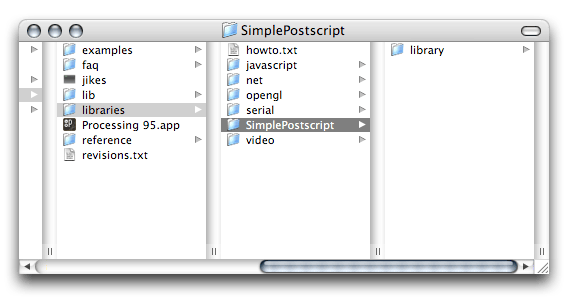 Dans le dossier Libraries de Processing, chaque bibliothèque doit avec un nom (ici SimplePostScript) et doit contenir un sous-dossier Library qui contient le nouveau code. Regardez-bien l'illustration et cela devrait devenir plus clair.