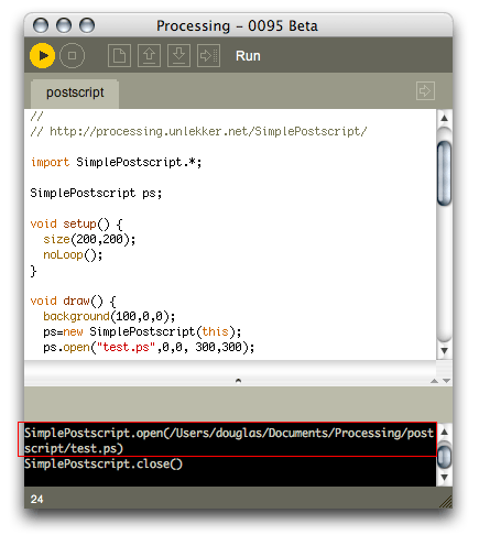 La plupart des bibliothèques viennent avec un exemple pour tester rapidement les nouvelles possibilités. Dans SimplePostScript ces exemples se trouvent dans un fichier qui s'appelle... exemples.html. Ouvrez-donc ce fichier, copiez une des exemples dans Processing, et appuyez sur lecture.