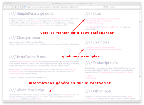 Si on sait lire un peu d'anglais (marius Watz lui-même se débrouille comme il peut, alors faites comme les européens) on peut voir que cette page n'a rien de méchante. On voit rapidement l'endroit où on télécharge la bibliothèque (c'est la partie qui nous intéresse), et qu'à côté d'elle il y a la documentation. Nous voyons aussi qu'il y a quelques exemples (toujours pratiques) et même des documents plus approfondis (aussi faits par des artistes, et non pas par des informaticiens!) pour aller plus loin dans la compréhension du PostScript.