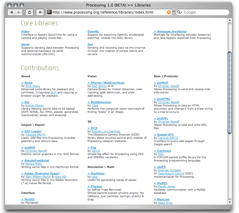 Une fois que vous avez trouvé la fonction magique qui vous manquait pour votre projet, cliquez sur son lien. Vous serez dirigé alors vers un site en dehors du site de Processing. Chacun de ces sites aura son propre esthétique, nous ne pouvons pas vous guider pas-à-pas sur chacun. Par contre, chacun des contributeurs cherche à rester aussi simple et clair que sur le site de Processing, alors normalement tout ira très bien.