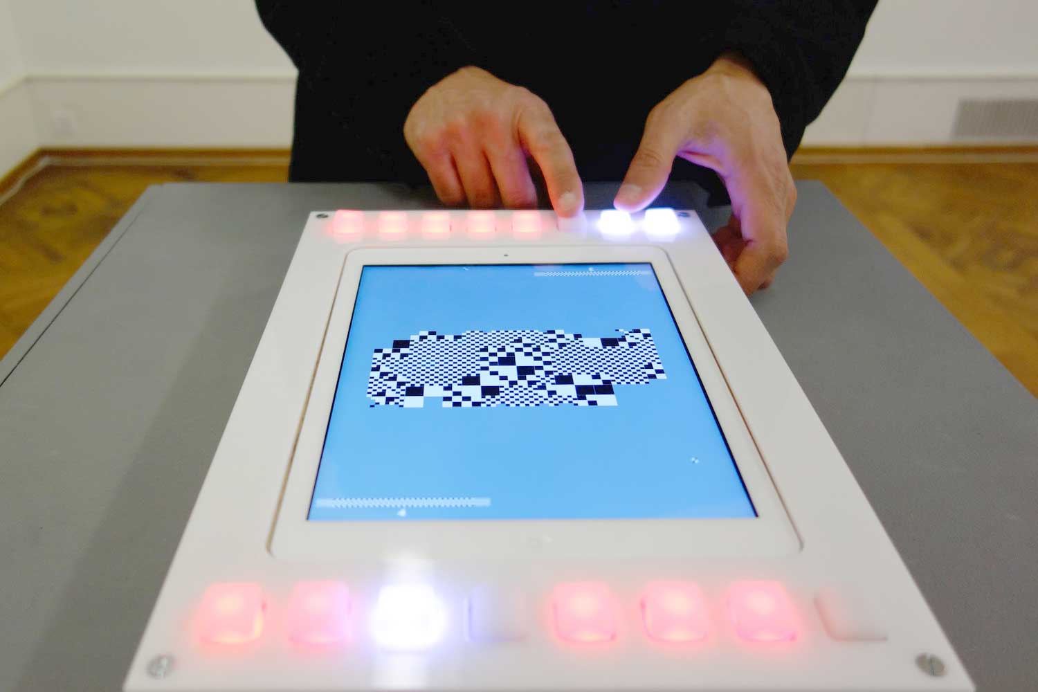 An updated version of this game controller was exhibited at the Retrocompatible Museum of the Short Cuts exhibition in 2015 where it was Karl Gerstner's Grand Œuvre that was dismantled by the movements of the moving square.