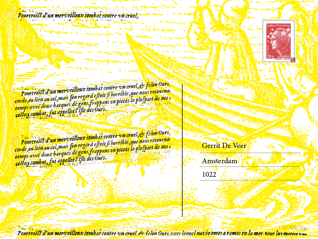 La correspondance is a proposal for a series of postcards based on a 16th century correspondence describing a series disasters and mishaps during a perilous trip to the north pole. Each post card contains a section of the original text. Readers buy the entire story through a subscription service, which then sends out each section of the story synchronized to its original reception date. La correspondance therein reproduces the real-time effects of following a difficult journey over several months: accidents, animal attacks, medical emergencies, mutilation, mutiny, survival and/or death.
