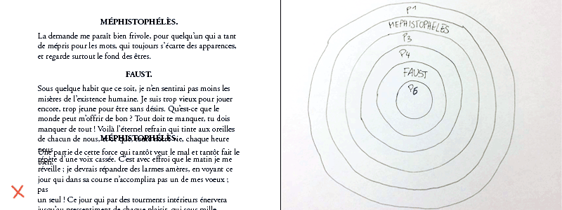 Processus. Le départ de notre travail est l’intérêt pour les aspects des livres qui ne sont pas, ou que partiellement, transmis par la numérisation. Le format, le poids, la texture ou l’odeur du livre ne sont expérimentables qu’en présence du volume en question. Comment, dès lors, évoquer ces aspects et redonner à la collection sa matérialité ? Le thème de Faust a retenu notre attention par son importance dans la Collection Bodmer. Le mythe du savant qui vend son âme au diable pour bénéficier d’un savoir plus grand nous a également paru représenter la quête de Martin Bodmer cherchant à créer la bibliothèque mondiale. Le grand nombre d’éditions du Faust de Goethe était une excellente occasion de travailler avec des contenus extrêmement diversifiés qui traitent d’un thème unique. Notre réponse au défi de communiquer la diversité et la matérialité de la collection s’incarne dans une nouvelle édition de Faust. Nous avons choisi d’extraire les éléments de livres numérisés, de les traiter et les injecter dans un programme, créé pour l’occasion, qui nous a permis d’en faire les pages de notre nouvelle édition.