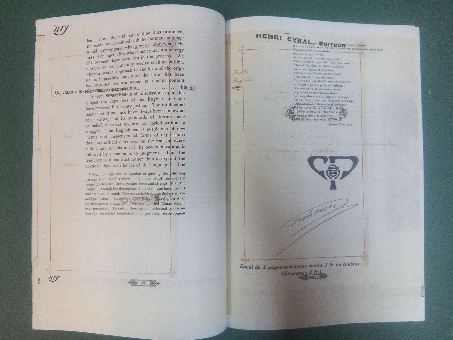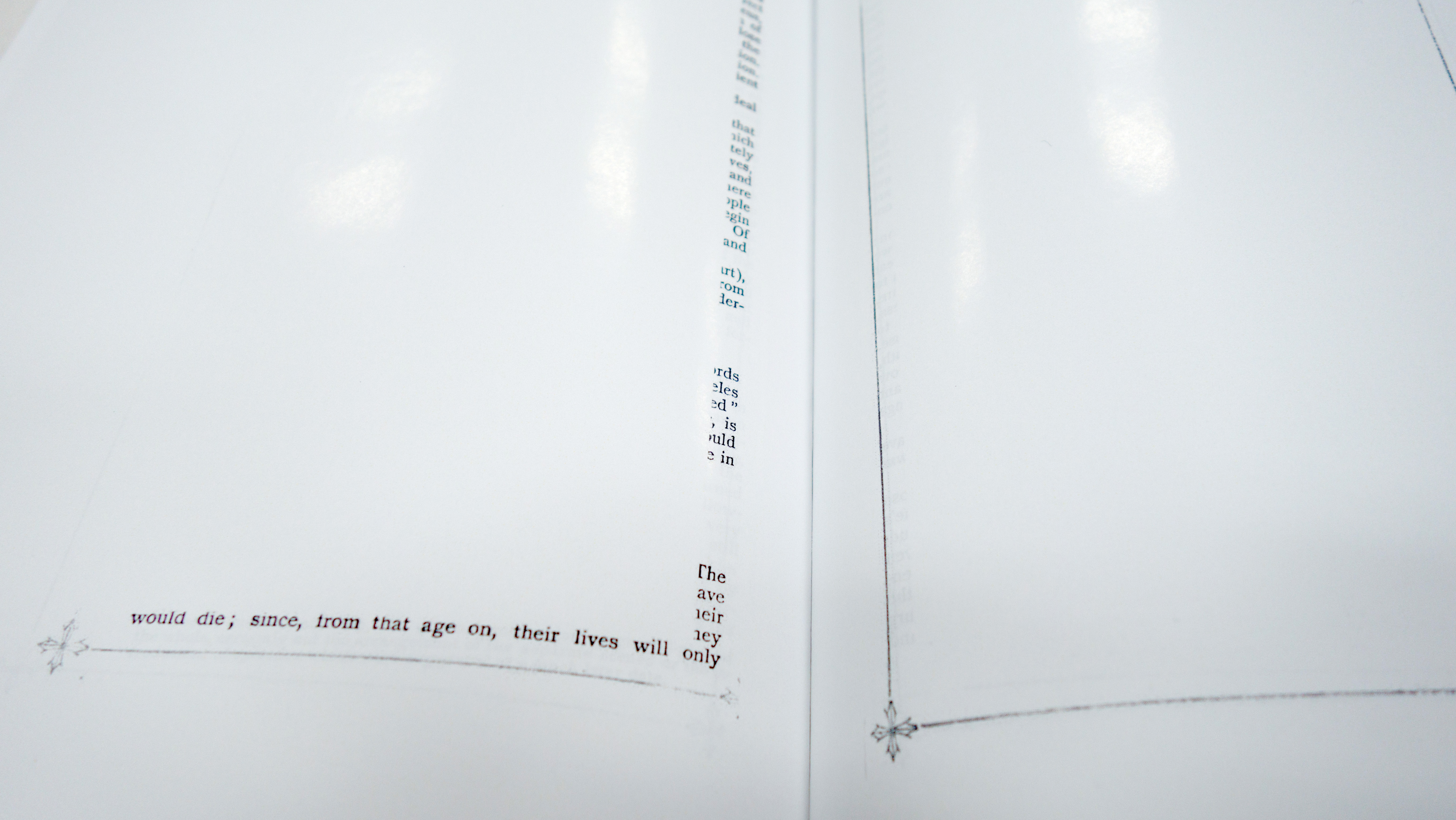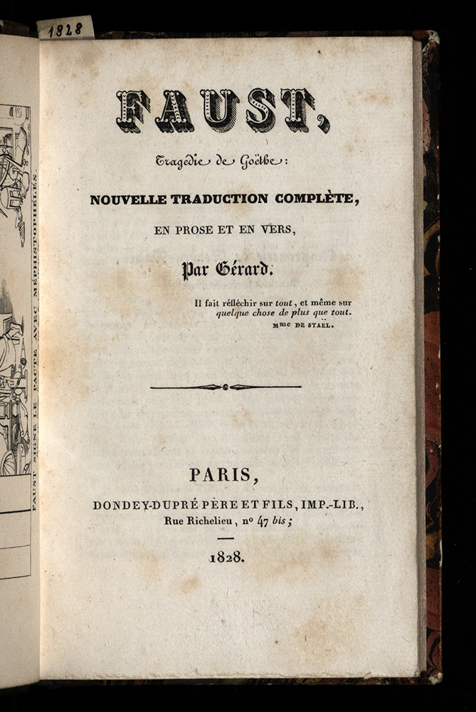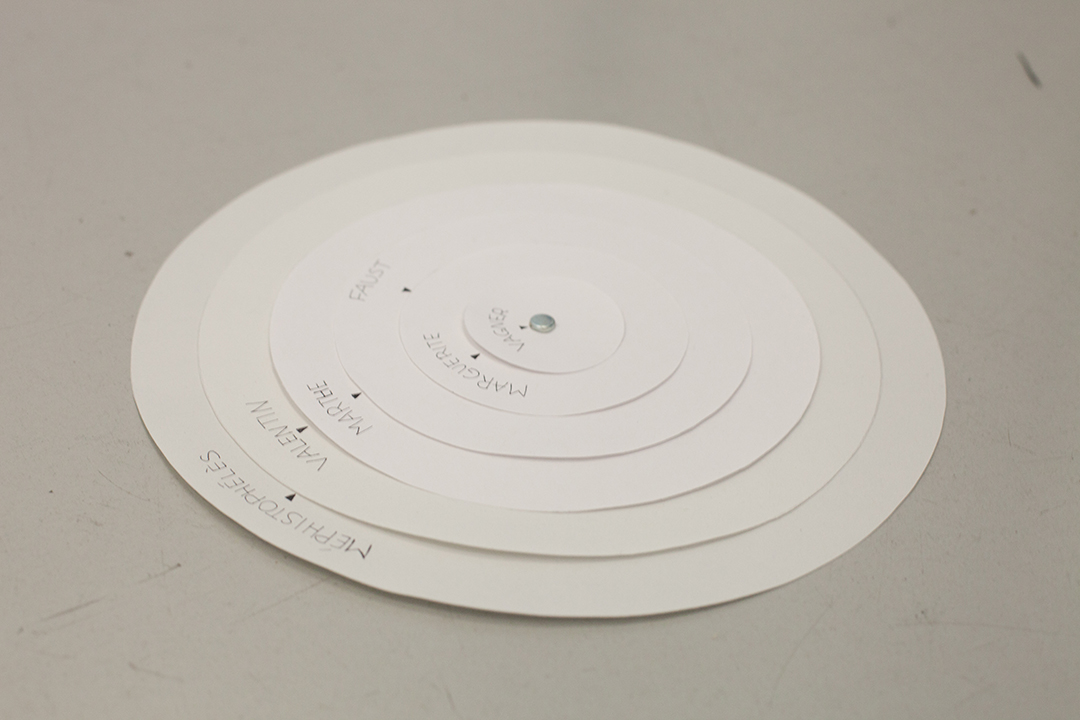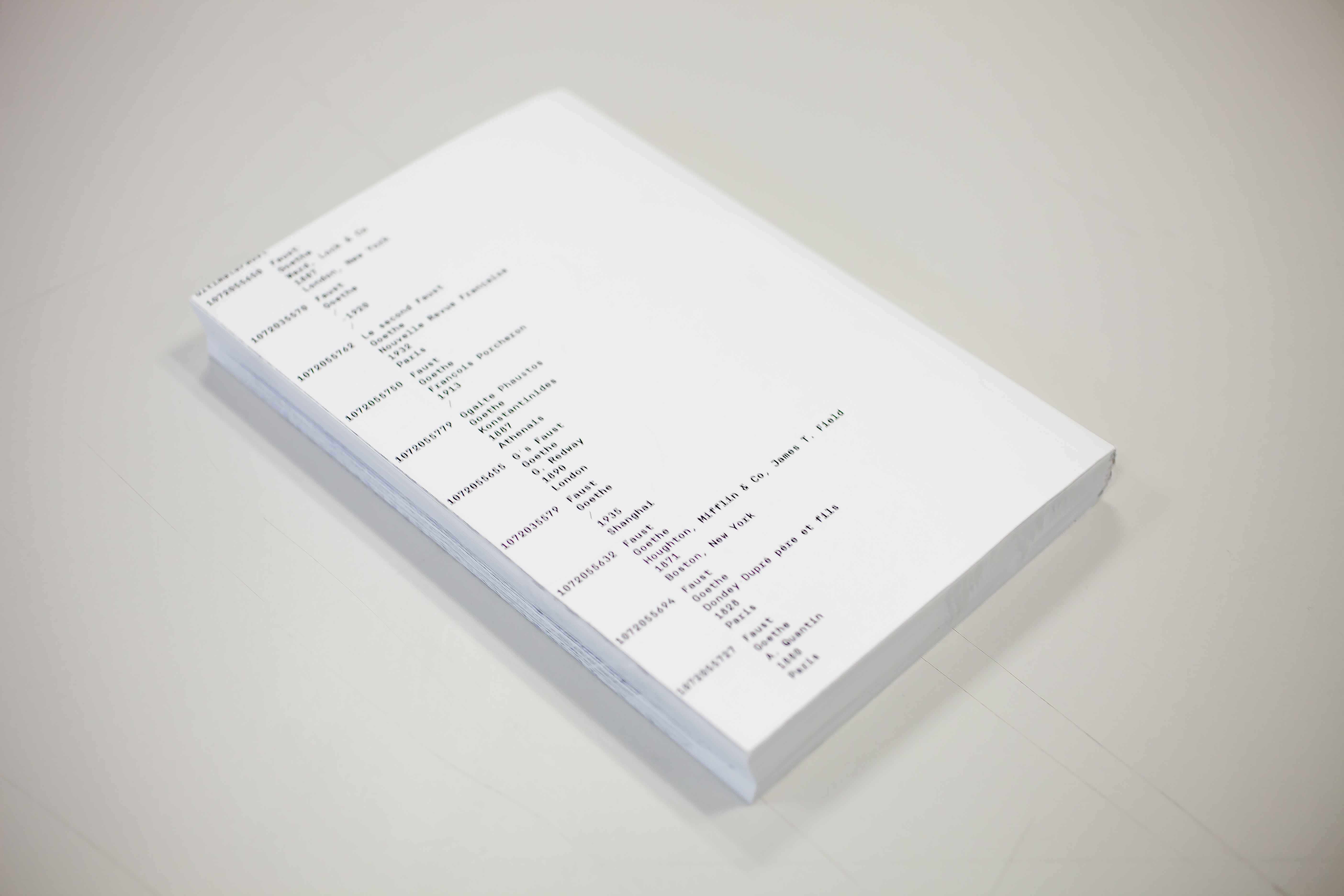 UltimateFaust. Ce projet propose de présenter la Collection Bodmer au travers d’un ouvrage ultime. Puisant dans la longue liste des éditions du Faust de Goethe, il en reprend des éléments qui caractérisent chaque livre, au-delà du texte lui-même. Le mythe de Faust, cher à Martin Bodmer, raconte l’histoire d’un homme qui cherche à atteindre la connaissance universelle, au point de vendre son âme au Diable. De la même manière, ultimateFaust réunit les plus belles caractéristiques de chaque ouvrage et les fonde dans un seul volume. Ce projet représente la Biblioteca Bodmeriana dans sa variété et dans son ambition. Loin d’être une sage réinterprétation graphique d’un récit maintes fois édité, ultimateFaust cherche à transmettre les particularités des différents volumes qui le composent. Reprenant le texte de l’un, les illustrations d’un autre, la pagination d’un troisième ou les ornements d’un quatrième, il mêle tous ces éléments dans un objet complexe. Cet enchevêtrement de signes fait directement écho au Faust alchimiste de certaines versions du mythe. De support, le livre se transforme en objet intrigant, dont le texte n’est plus la seule raison d’être.