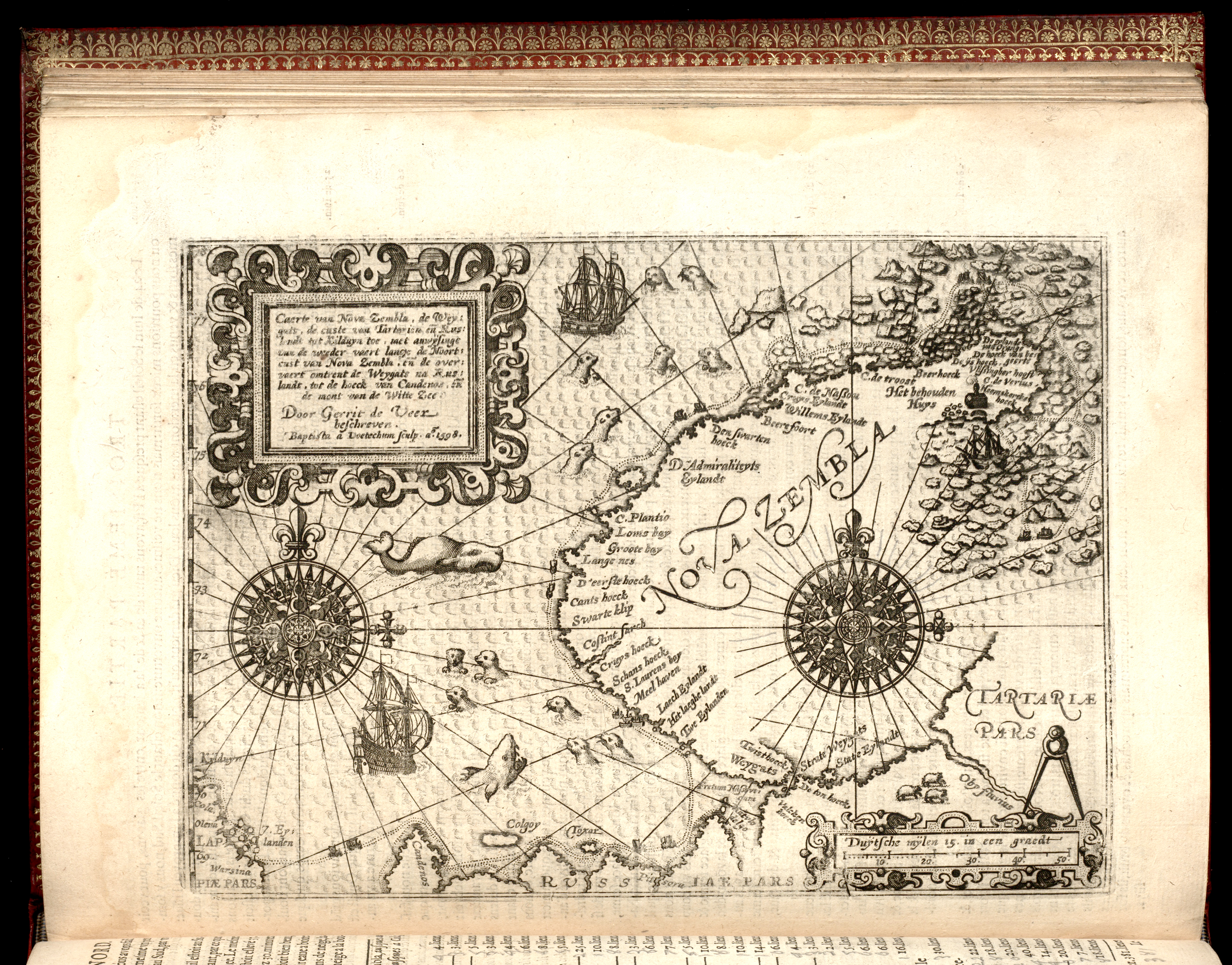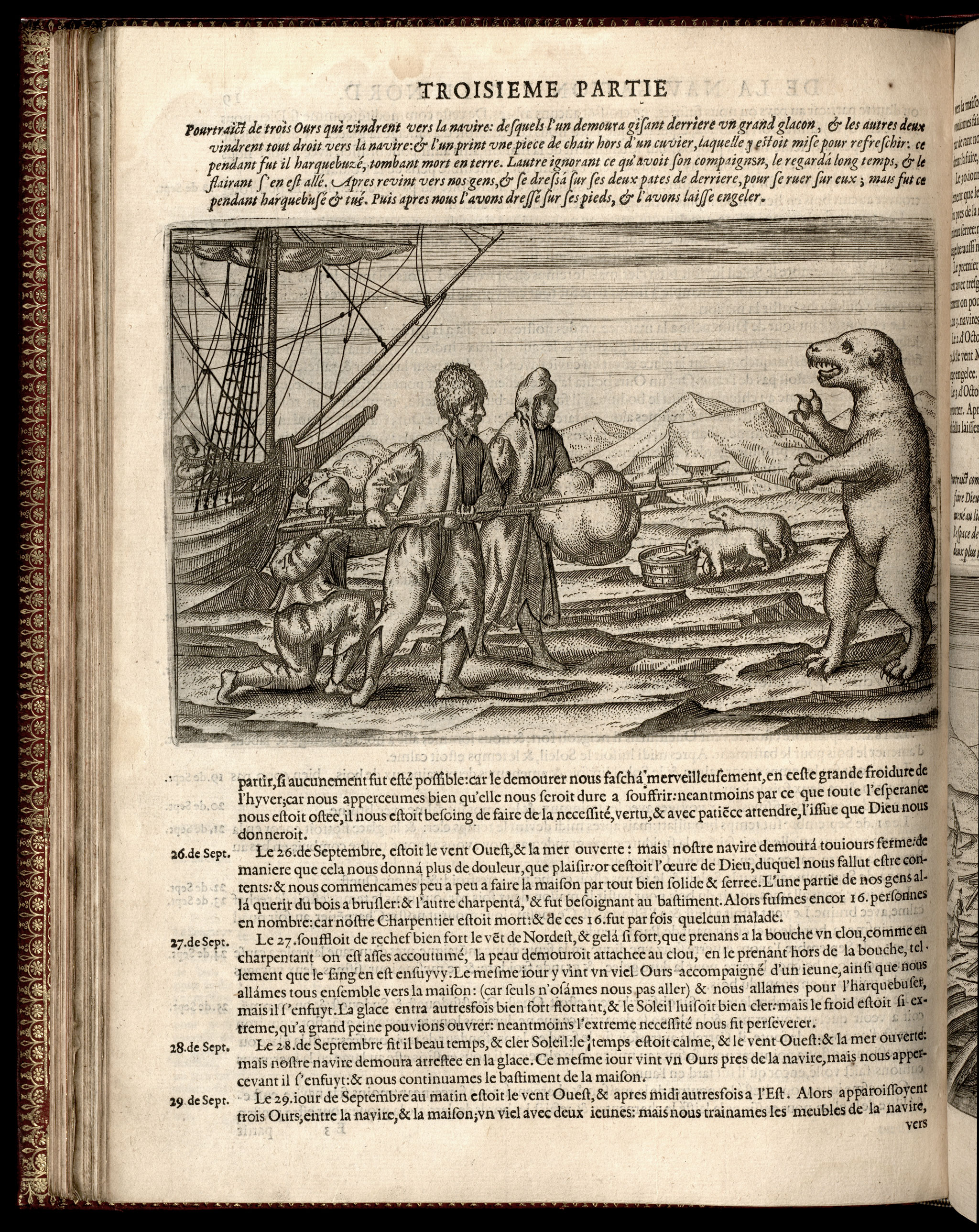 13: Nous auront parcouru au total 2’800 km, en passant par la Moscovie et en longeant la Scandinavie sur une durée de 16 mois en chaloupe, sans jamais pouvoir rejoindre les Indes. Les gravures originales sont réalisées par Théodore de Bry en 1598 et sont parues dans le livre « India Orientalis III (Petits voyages, vol.3) - Discours de la troisième navigation faite par le Nord, vers les Royaumes de Cathay et de China, en l’an de 1596, in Vray description des trois voyages de mers très admirables faits en trois ans. » (Edité à Amsterdam) L’auteur des textes est Gerrit de Veer lui-même.
