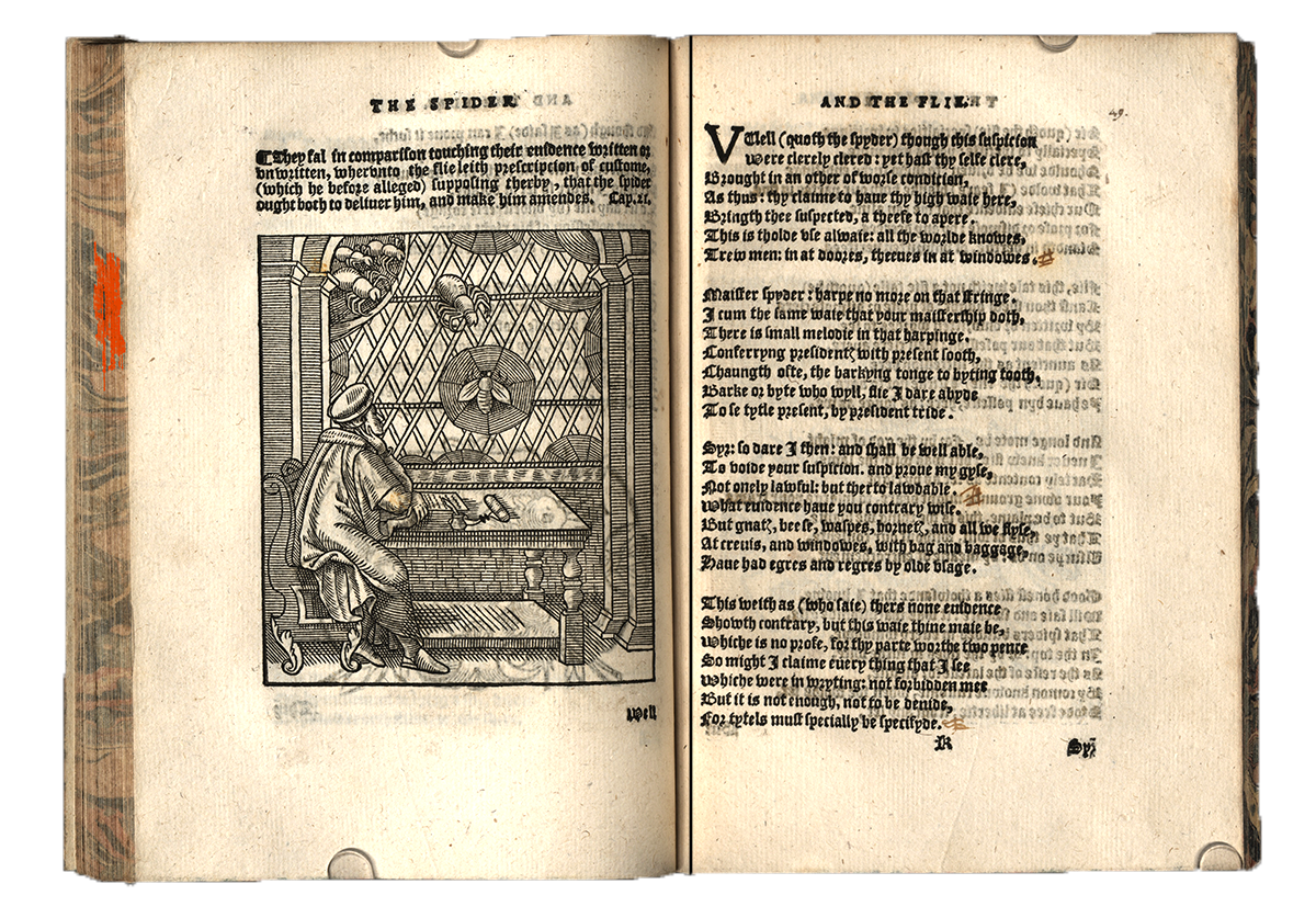 Beginning with « The Spider and the Flie », John Heywood, 1556. Many detailed illustrations with very small changes. Big book – folio: 96,5*63,5 cm. illustrations around 50 cm. Small characters, tiny details.
