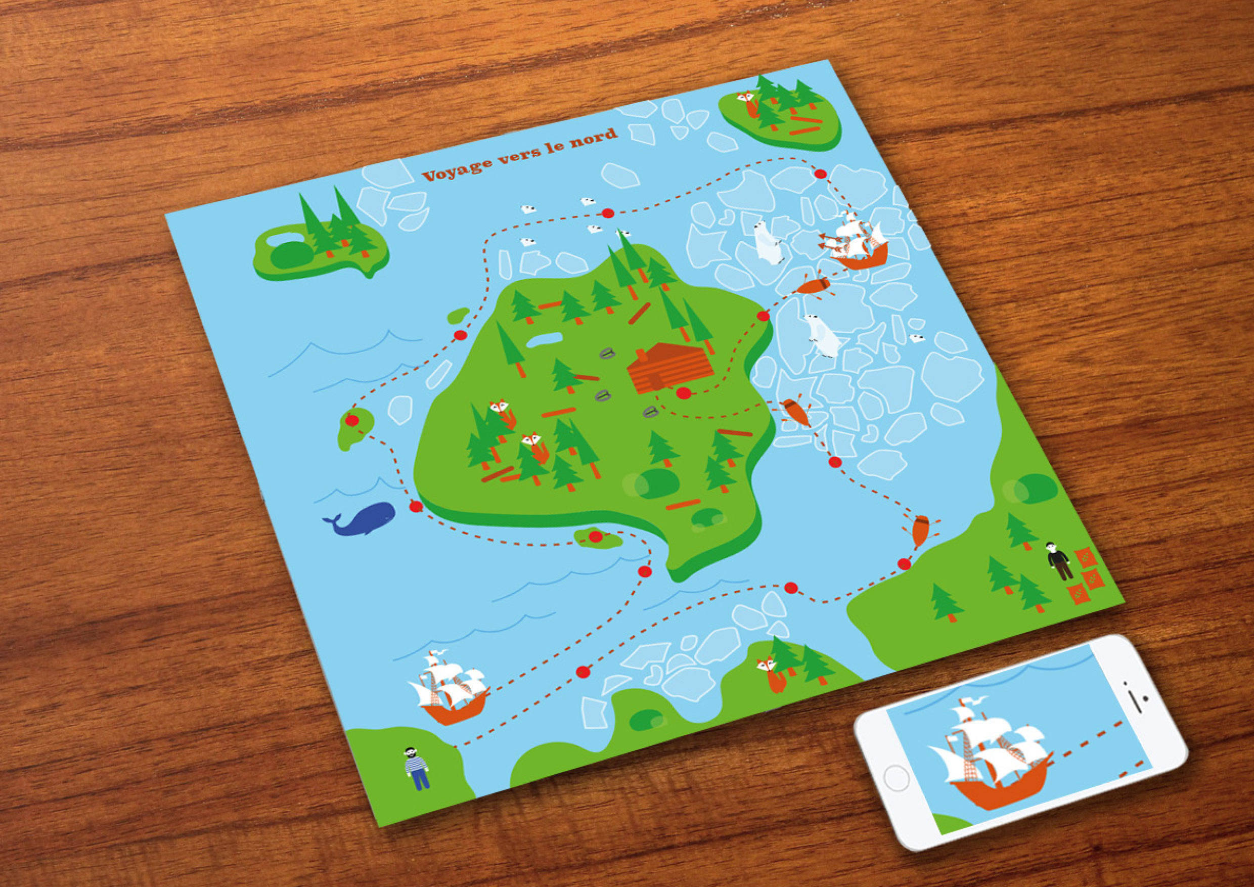 Par rapport au Bodmer Lab, nous avons choisi le récit de Gerrit de Veer (livre de Théodore de Bry, avec gravures), « Voyage vers le Nord ». Ce livre du XVIe siècle a été numérisé par le Bodmer Lab et est disponible en ligne. Nous avons voulu rendre accessible les livres numérisés aux enfants, avec un récit simplifié et un graphisme efficace.