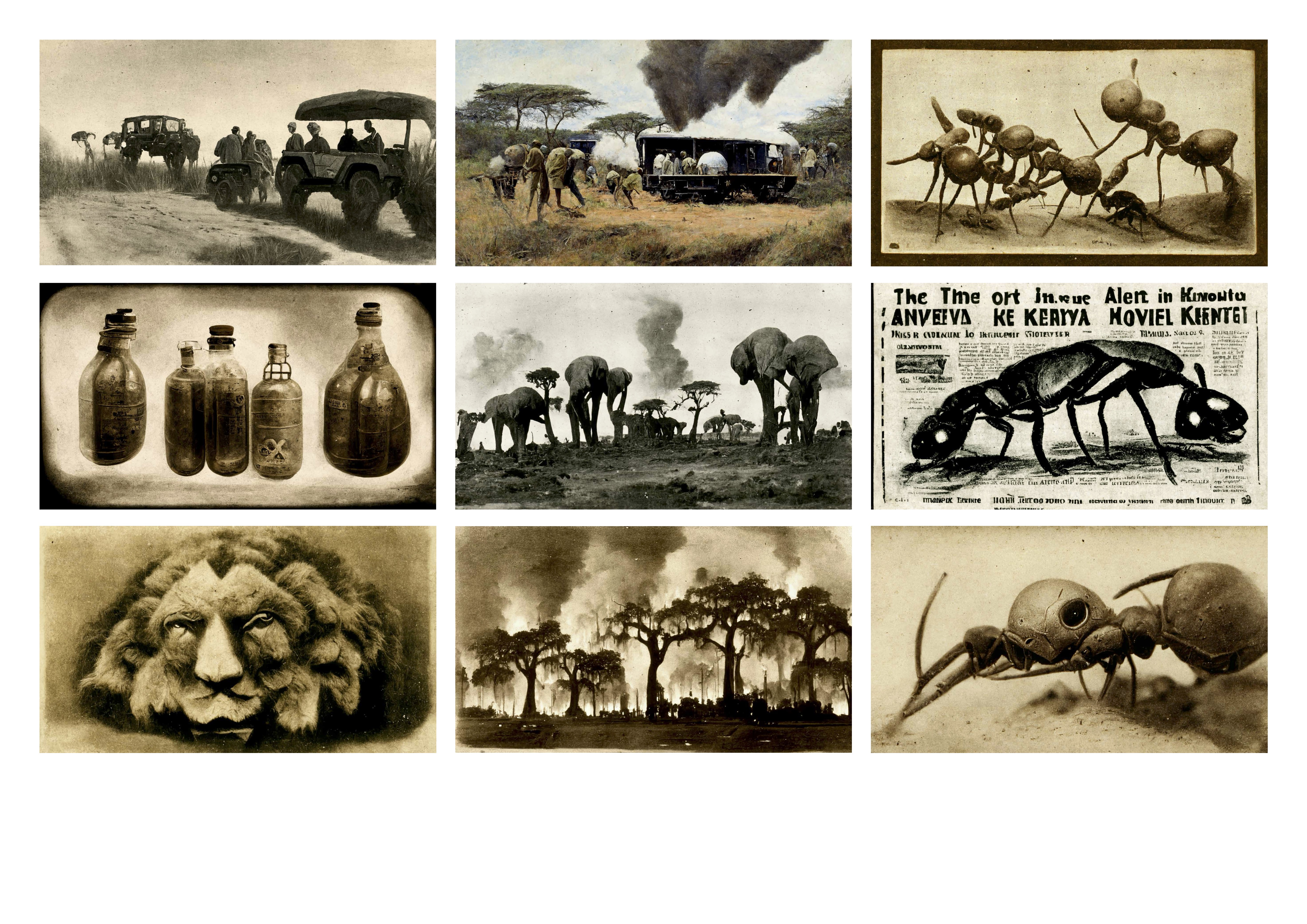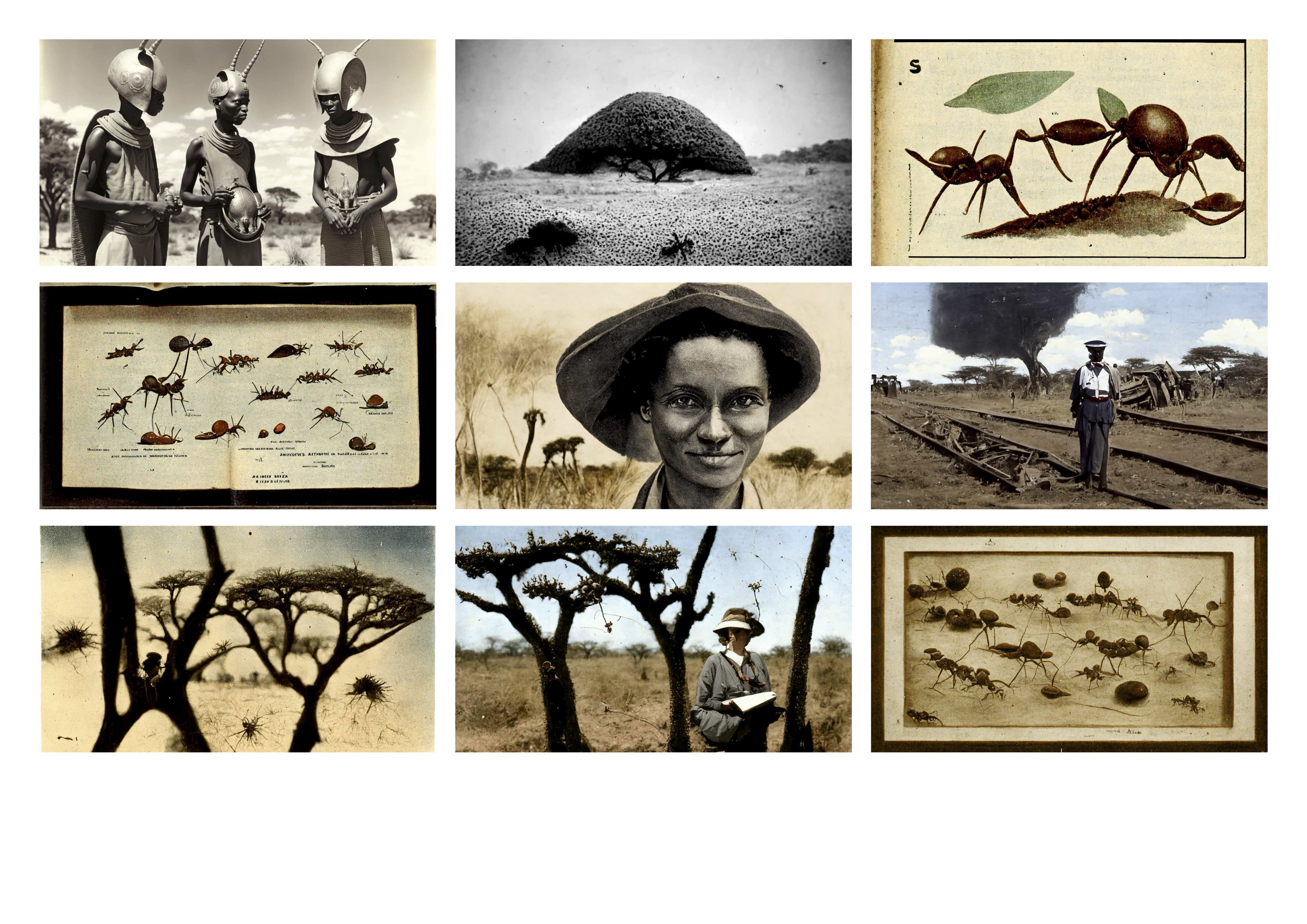 Inspired by a newspaper article about an ant invasion in Kenya, this project explores distinctive narrative traits of artificial intelligence: the linking of historical and fictional elements, the creation of composite characters blending real and imagined profiles, and the generation of ambiguous images that blur the boundary between archive and invention.