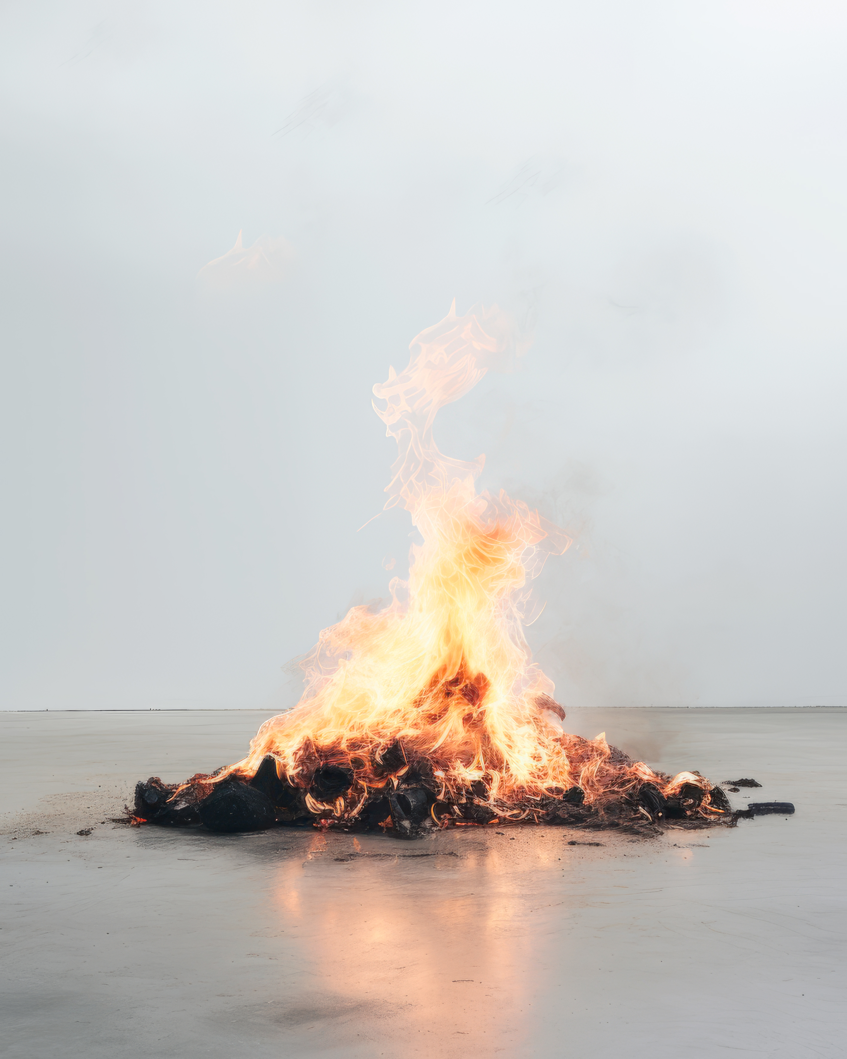 Capturing an apparently simple image of a fire burning against a white wall is impossible. The camera sensor fails to distinguish the intense light of the flames from the whiteness of the background: two luminous intensities that cancel each other out. Using an image generator, Chloé Richard creates an illusion — a simulacrum of a photograph — recreating what the camera cannot capture.