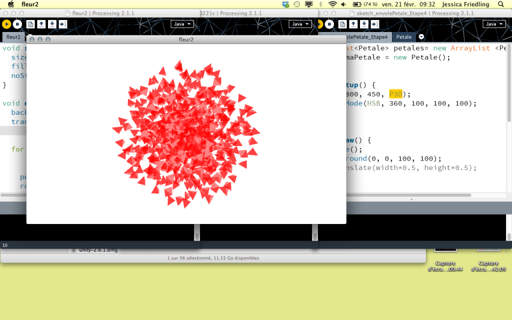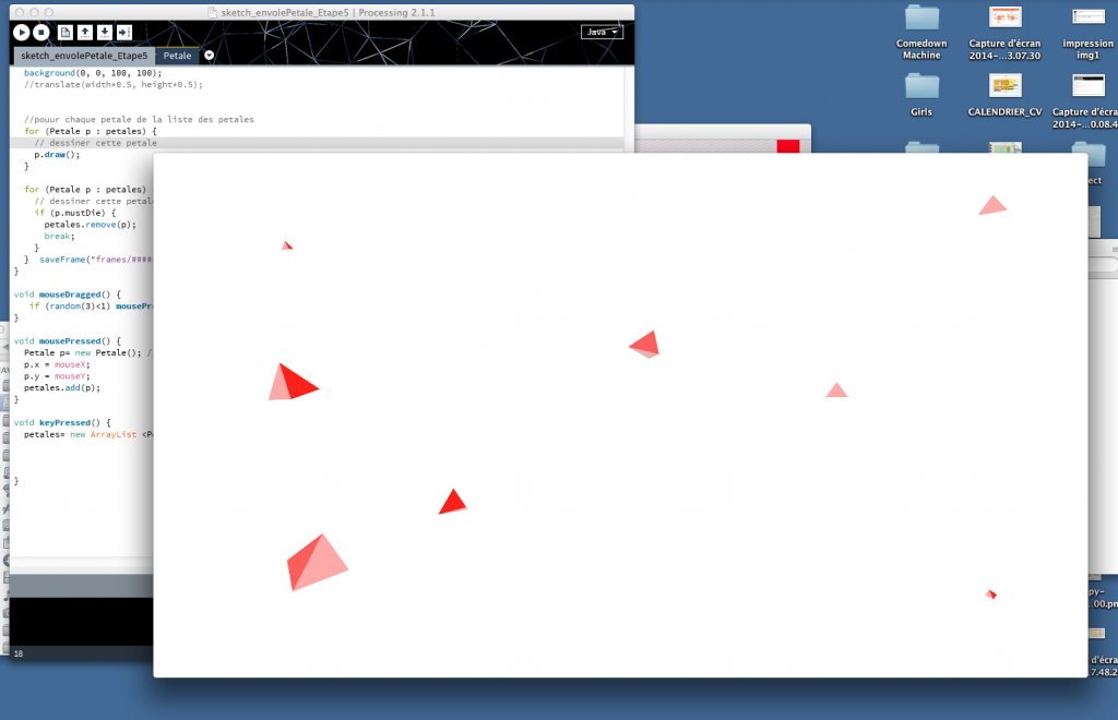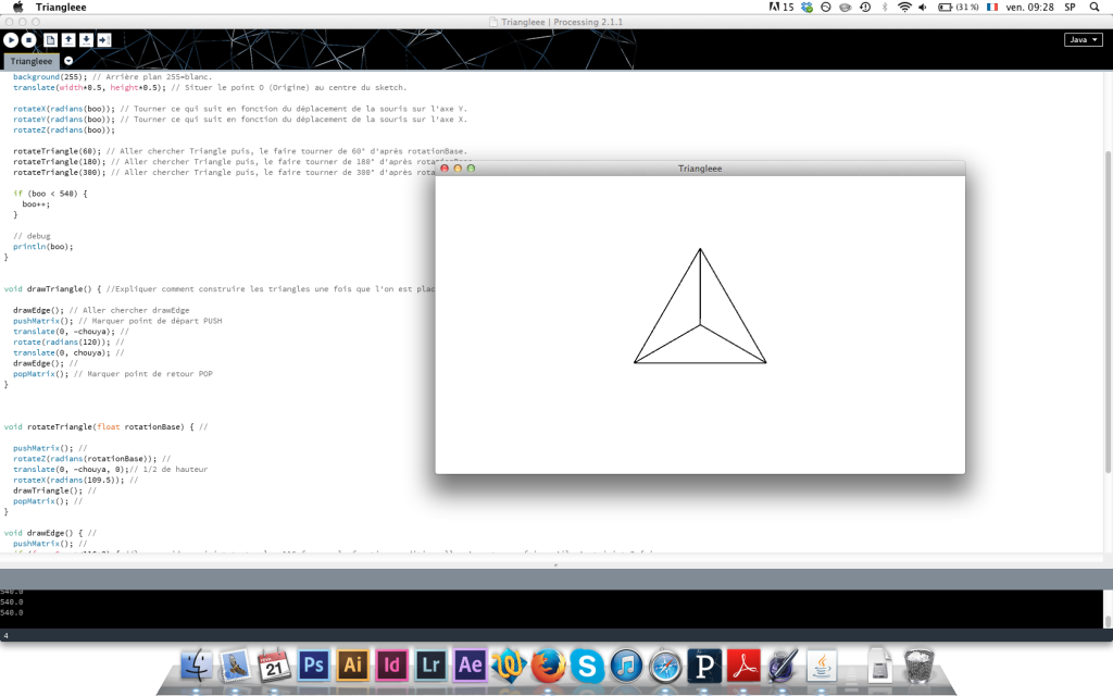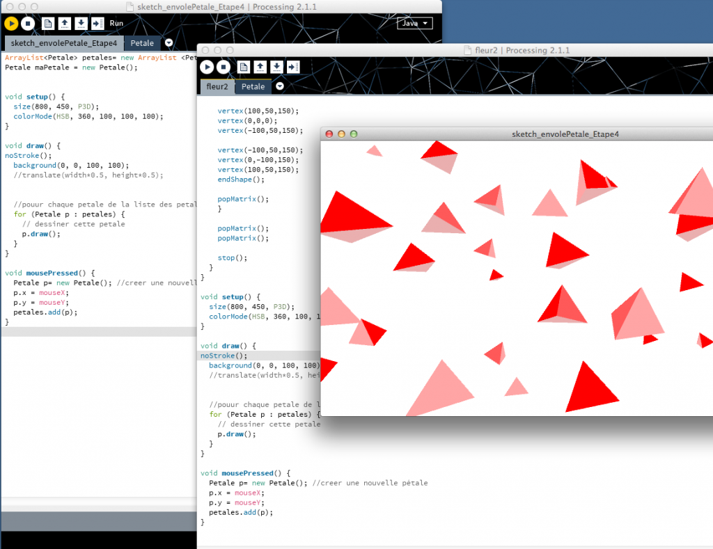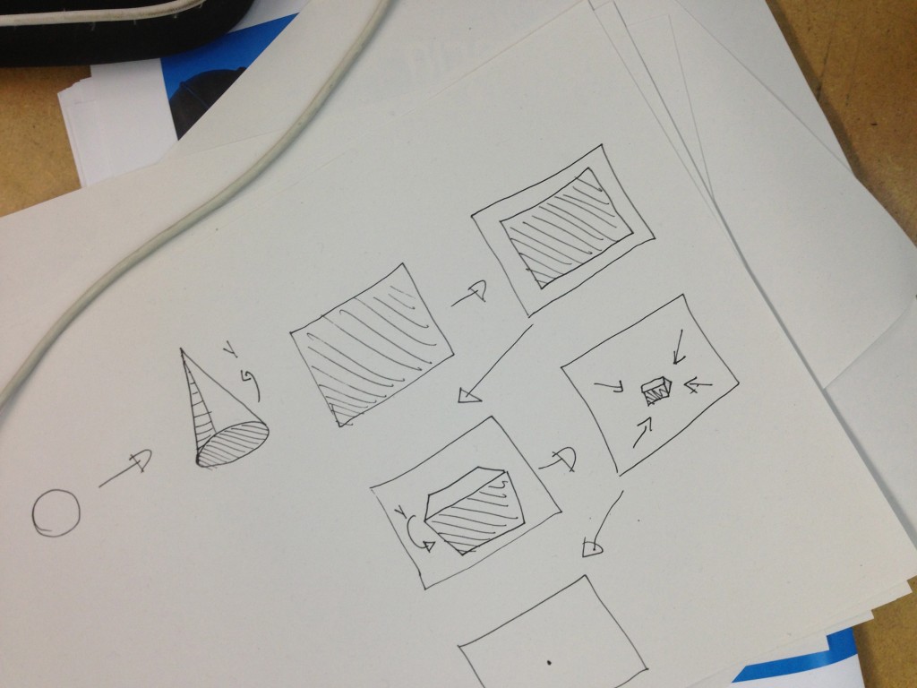 Dans un premier temps, nous avons exploré la syntaxe de base informatique qui compose toute image générée sur ordinateur (pixels, vecteurs, modèles en trois dimensions,...). Ensuite, nous avons exploré ce langage en partant de la notion de « transformation » pour générer du graphisme en mouvement.