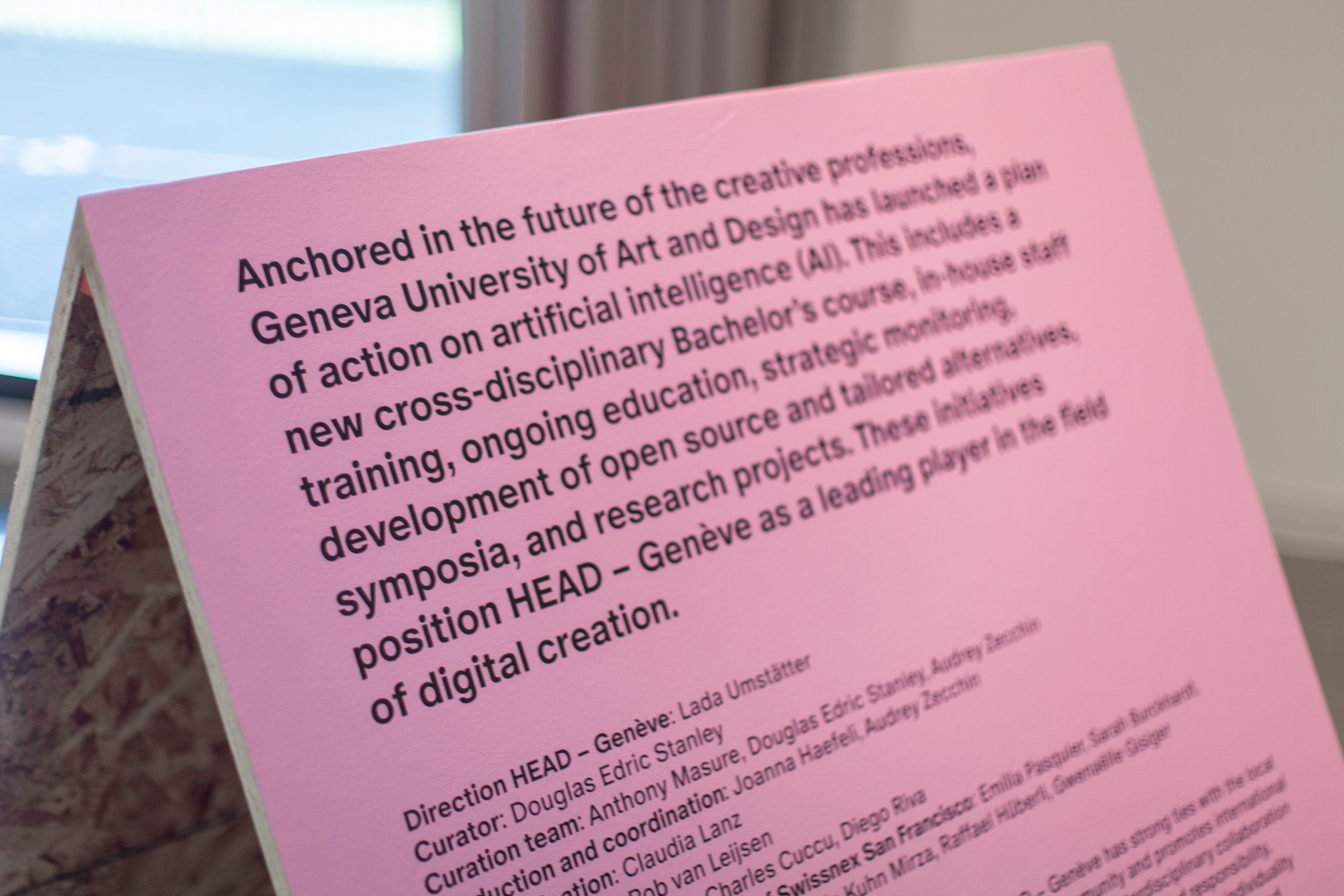 About the exhibition The exhibition is free and open to a curious audience starting on August 19, 2024. Visitors of the exhibition have the opportunity to explore how HEAD – Genève’s initiatives in AI are shaping the future of digital creation and artistic expression. Through the dialogue between the artworks of Weiyu Chen, Léonie Courbat, Jeremias Fries, Alexandra Galian, Margot Herbelin, Elie Hofer, Quentin Piel Langlet, Mathis Baltisberger, Basile Brun, Chloé Richard, and Elsa Wagnières, and the research projects of Sylvie Boisseau, Sabrina Calvo, Kévin Donnot, Élise Gay, Guillaume Helleu, Sonia Laugier, Nicolas Nova, Anthony Masure, Alexia Mathieu, Étienne Mineur, Douglas Edric Stanley, and Frank Westermeyer and David Zerbib, the exhibition seeks to inspire and provoke thought about the intersection of AI, art, and design. It showcases how these fields can collaborate to push the boundaries of creativity.