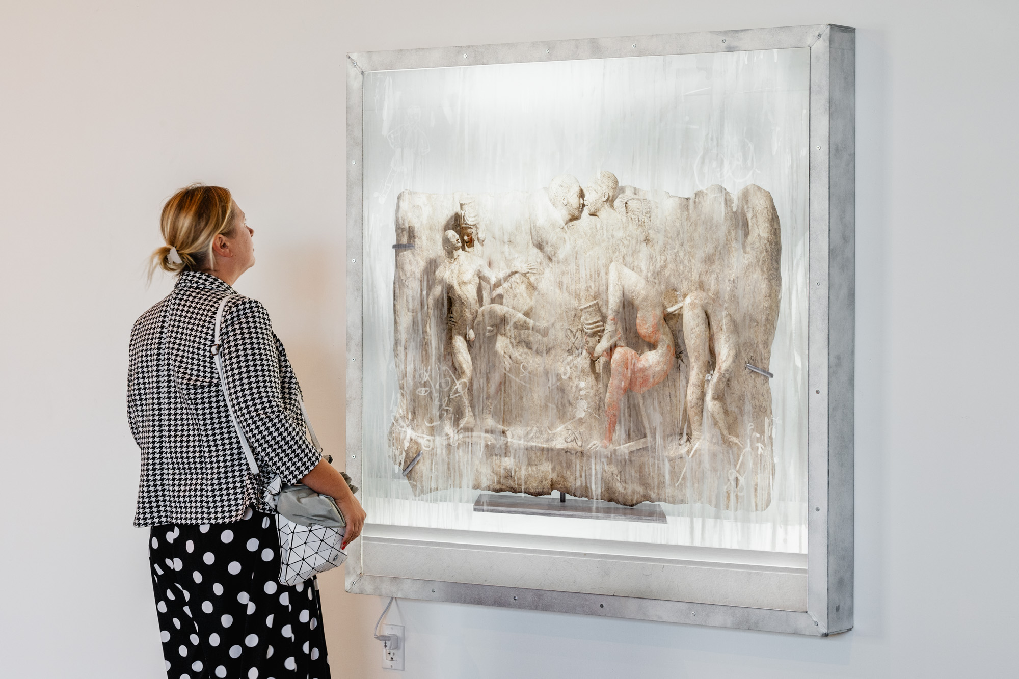 To embody this concept, the artist worked from a text generated by ChatGPT that adheres to the conventions of ancient texts. He then interpreted this text by digitally sculpting a bas-relief whose iconography leaves no ambiguity regarding the homoerotic relationships. The staging of the artwork within a luminous display case enhances the object’s credibility. The mist and dirt obscuring its contents create a parallel between its rediscovery and the varied interpretations throughout history.