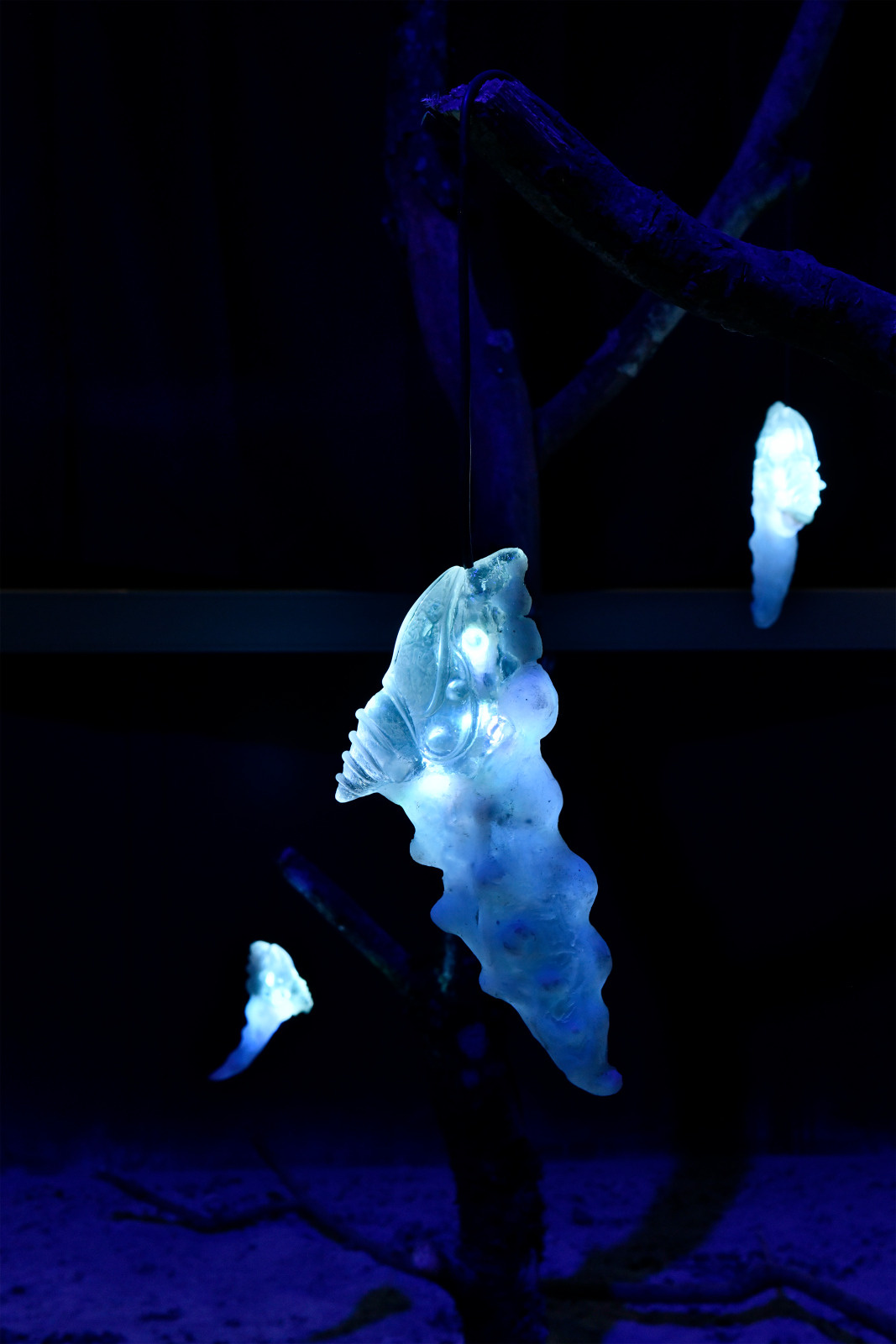 Bismuthocris Chrysallis is the materialization of one of the species envisioned by the software Stable Diffusion as part of Elsa Wagnières’ Master’s project titled Vermins. In her thesis, Elsa crafted a fictional bestiary illustrating 52 fictitious species that have adapted to the environmental upheavals caused by the extraction industry of components found in an iPhone 5S. Among these 52 species is the Bismuthocris Chrysallis, a type of chrysalis found near the open pit mine of San Cristobal in Bolivia. At first sight inert, these sculptures realized in collaboration with Alpha Syn emerge as a species adapted and integrated into an environment marked by the Anthropocene. Utilizing man-made materials for camouflage and sustenance, it has succeeded in surviving and thriving.