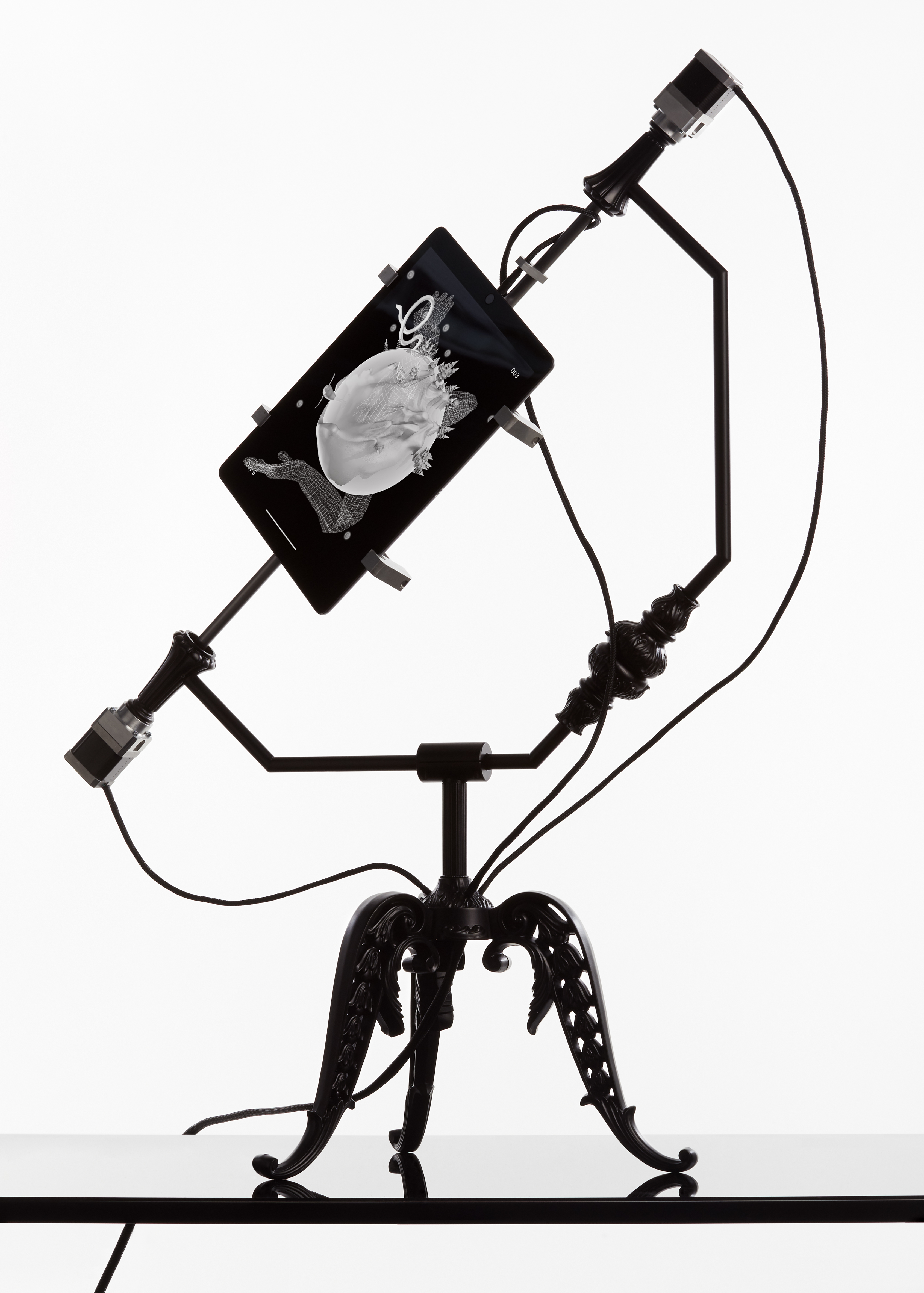 Genèse is a curious object that doubles as a rotating globe. As it rotates an interactive tablet on its axis — one rotation per day — the tablet displays an offbeat retelling of the seven days of creation of the world. This generative landscape is altered and modified according to the interactions that people have with the tablet: a simple contact with the screen disrupts the natural cycle of creation of mountains, animals, humans, rivers, and trees.
