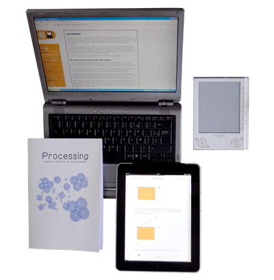 Actuellement nous sommes à mi-chemin sur notre manuel collectif sur Processing, écrit à huit mains en cinq jours, en utilisant la technique du Booksprint sur la plate-forme Floss Manuals. Ce livre est écrit directement en français. Il ne s'agit pas d'une traduction.