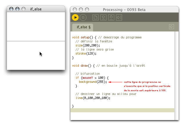 Cet exemple nous montre le choix que l'ordinateur peut faire à votre place sur le fonctionnement de votre programme. C'est comme si notre programme contennait deux sous-programmes potentiels : un premier programme quand la position vertical de la souris est plus grande que 100 pixels, et un autre programme dans le cas contraire.