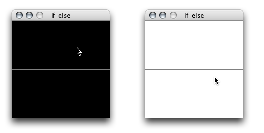 Ce programme dessine un fond gris, mais quand la souris est en dessous de la ligne du milieu (quand il est plus grand que 100 sur l'axe vertical) le fond devient blanc. Notez que le fond ne change plus de couleur dès que le fond est devenu blanc. C'est parce que nous n'avons pas de cas contraire : au début de l'animation le fond est gris (par défaut), puis dès qu'on passe en dessous la ligne le fond devient blanc.