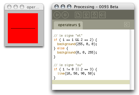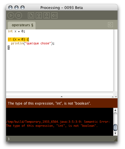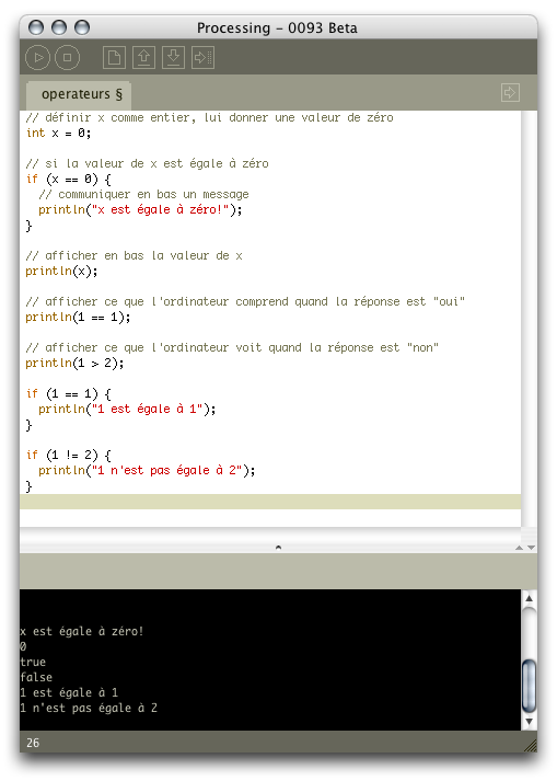Comme le montre l'exemple (regardez bien en bas de la fenêtre), l'ordinateur pose une question quand il voit le code x == 0. Par contre, il attribue une valeur quand il voit le code x = 0. Le signe égale à (=) donne une valeur, alors que signe est-il-égale-à (==) compare les valeurs et donne un résultat "vrai" (true) ou "faux" (false). Ce sont donc, en langage informatique, une opérateur de comparaison. C'est une opérateur parce qu'il donne des résultats, mais ces résultats ne sont pas de valeurs normales : ces résultats sont des valeurs true ou false. D'ailleurs, si on essaie de mettre une égale-à classique (=) à l'intérieur des parenthèses, Processing va râler :