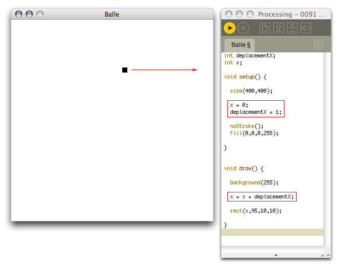 Lors de chaque cycle de la méthode draw( ), la variable deplacementX augemente la valeur de la variable x. Puisqu'on dessine, 30 fois par seconde, un rectangle à la position de cette variable x, chaque fois que la valeur de x change, la position du rectangle change.