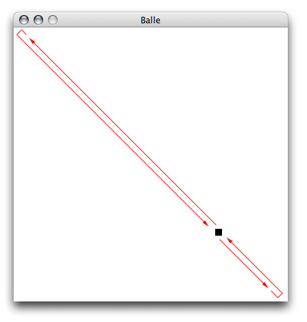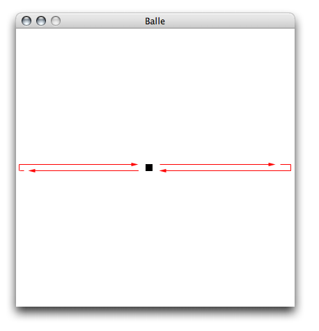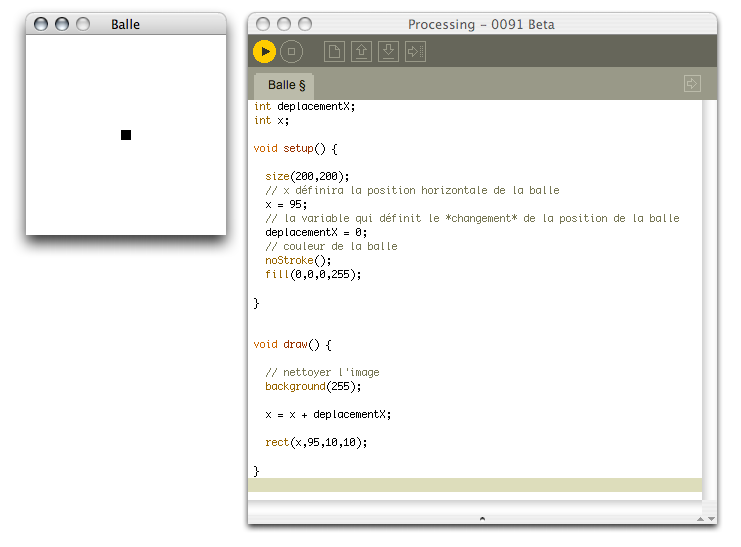 Rien n'a changé dans le résultat sur l'écran, mais notre programme est maintenant prêt à être modifié sans devenir illisible. On peut, par exemple, maintenant ajouter le mouvement/rebondissement vertical, voire même ajouter une notion de vitesse, sans créer une bouillie de code dans notre fenêtre de programmation.