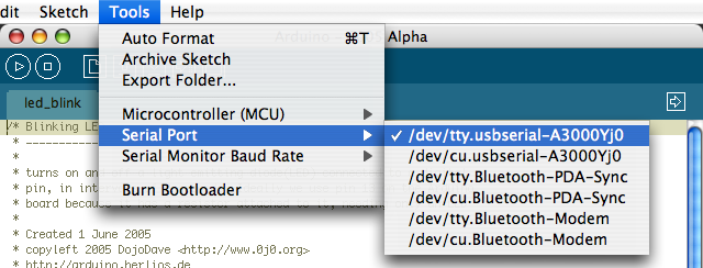 Pour tester la communication entre Arduino (programme) et Arduino (carte), nous devons activer le bon port de communication. Sur beaucoup d'ordinateurs il y a plusieurs port série. Sur un macintosh nous trouvons par exemple " modem " et " Bluetooth ", en plus des ports que nous avons installé via les installeurs FTDI. Pour sélectionner le bon, aller dans le menu " Tools > Serial Port > " et sélectionner le premier de la liste qui contient " usbserial ". Le mien s'appelle " /dev/tty.usbserial-A1015 ", le votre s'appelle peut-être " /dev/tty.usbserial-A3000Yj0 " :
