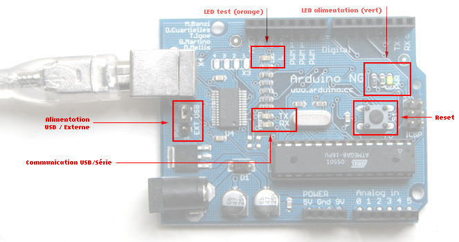 maintenant nous allons vérifier si la connection USB<>Arduino fonctionne. Pour le faire, il suffit de brancher la carte Arduino dans la port USB. Voici une image qui montre tous les points clé de votre carte Arduino :